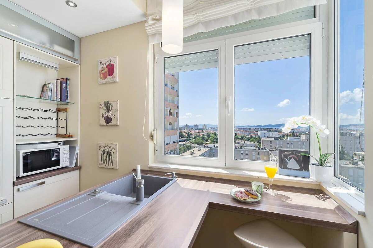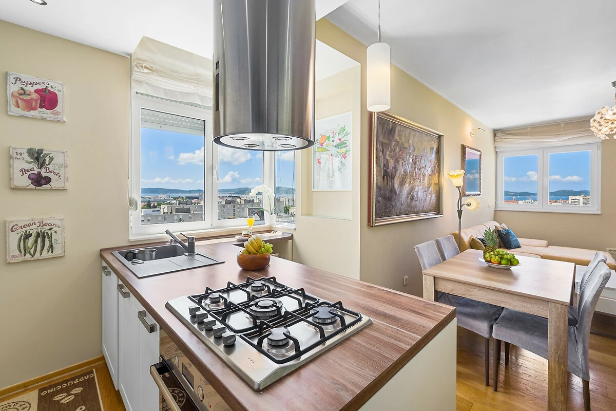 Die Wohnung bietet eine laptop-freundliche Umgebung mit kostenlosem WLAN, einem privaten Wohnzimmer mit Sofa und Flachbild-TV sowie einem gemütlichen Essbereich. Geniessen Sie Stadt- und Meeresblicke, während Sie sich in der Annehmlichkeit der Klimaanlage entspannen. Die Küche ist vollständig ausgestattet mit essentiellen Geräten, einschliesslich Herd, Toaster, Geschirrspüler, Wasserkocher, Kaffeemaschine, Kühlschrank, Gefrierschrank, Ofen, Mikrowelle, Geschirrspüler, allen notwendigen Küchenutensilien und einem Esstisch. Es gibt ein Badezimmer mit Badewanne, Toilette, Waschmaschine, Trockner, Haartrockner und Toilettenartikel. Es gibt keinen Aussenbereich, aber einen wunderschönen Meer- und Stadtblick.
