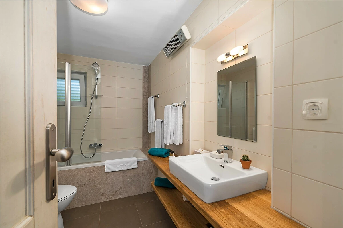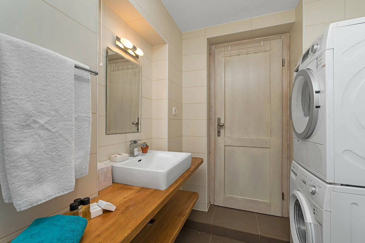 Die Wohnung verfügt über eine voll ausgestattete Küche mit modernen Annehmlichkeiten wie einem Herd, Ofen, Geschirrspüler, Kühlschrank, Gefrierschrank, Mikrowelle, Wasserkocher, Kaffeemaschine, allem notwendigen Küchengeschirr und einem Esstisch. Der Wohnbereich umfasst ein privates Wohnzimmer mit einem Flachbild-Fernseher, der Komfort und Unterhaltung für alle Gäste sicherstellt. Es gibt zwei Badezimmer mit Toilette, Dusche und Föhn.