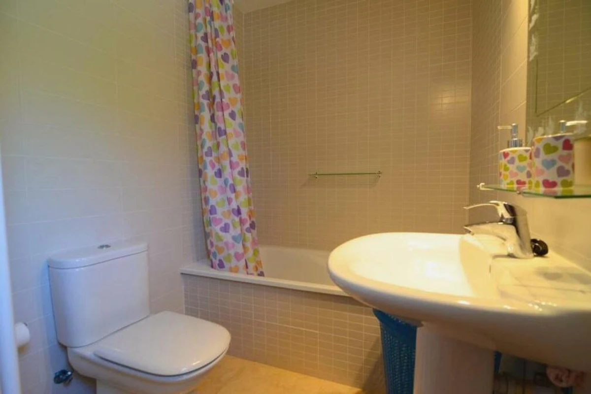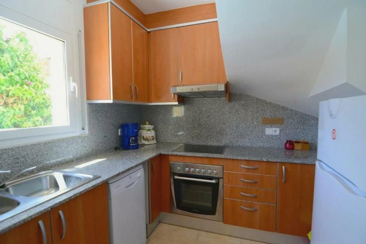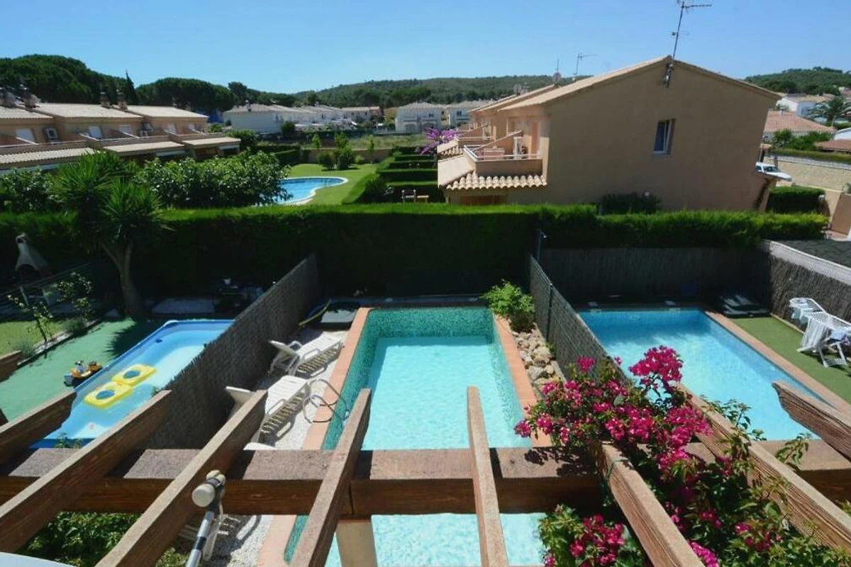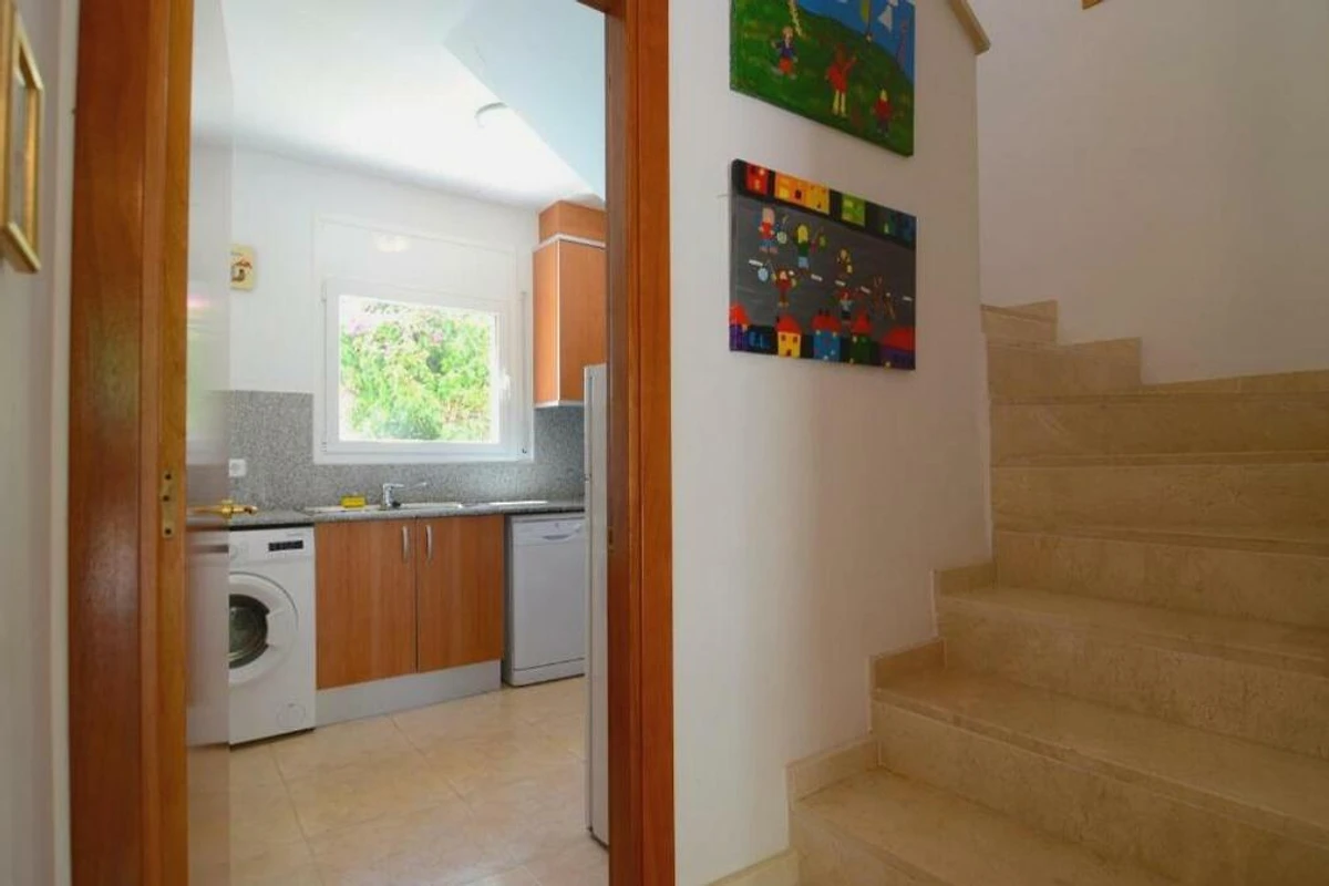 Dieses Reihenhaus eignet sich ideal für Familien. Es verfügt über drei Schlafzimmer – eines im Erdgeschoss und zwei weitere im Obergeschoss – und bietet Platz für bis zu sechs Gäste. Oben ein Zimmer mit ein Doppelbett und ein Zimmer mit Etagenbett, unter ein Zimmer mit einem französischen Bett. Der Innenraum ist gemütlich gestaltet und sorgt für eine warme, einladende Atmosphäre. Ein privater Swimmingpool lädt zum Entspannen ein. Im Untergeschoss befinden sich auch das helle Wohnzimmer mit Zugang zu der Terrasse und Pool und die separate Küche sowie eine Gästetoilette.