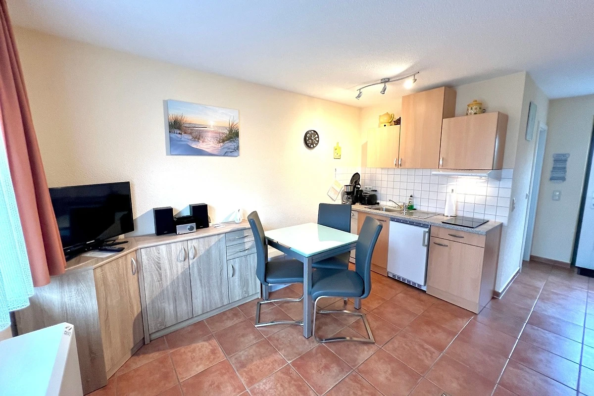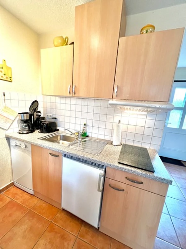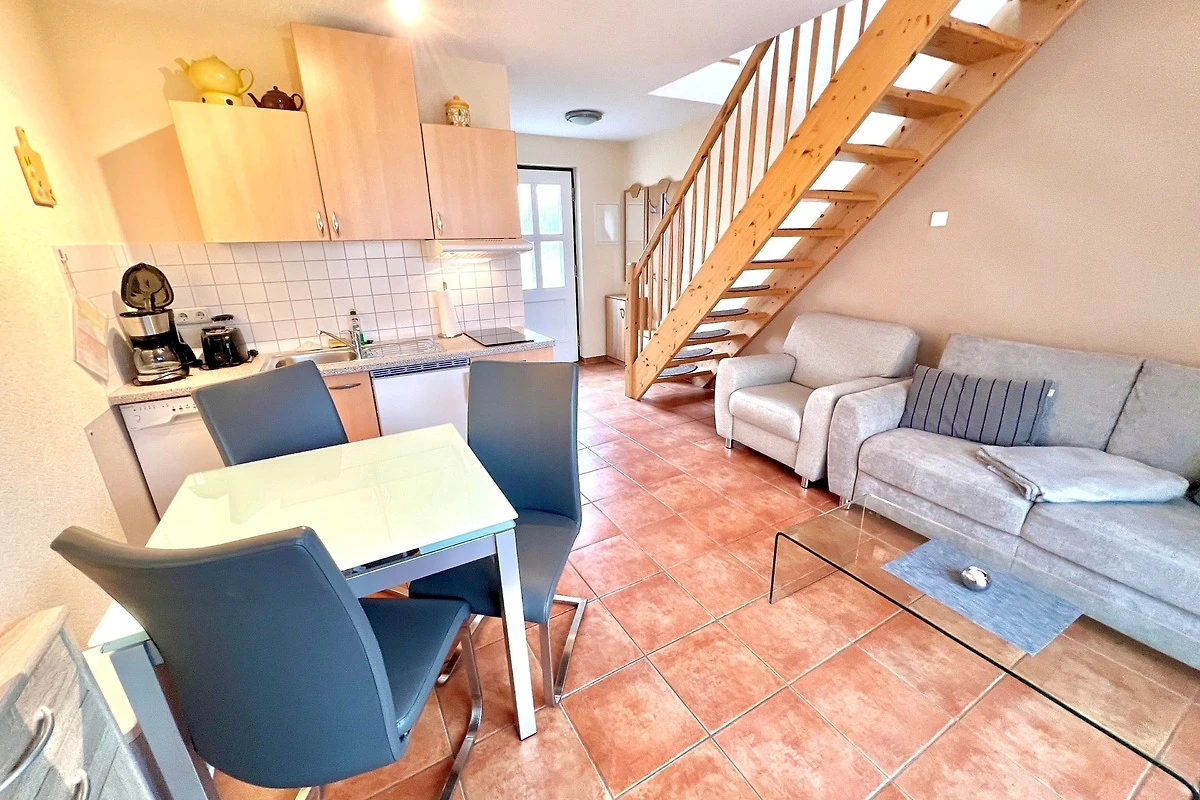 Gemütliche Ferienwohnung auf 42qm. Unten Wohnbereich mit Sofa, Sessel, FlachTV, Radio und kleiner Küchenzeile mit sehr guter Ausstattung. Angeschlossener Terrasse mit Gartenmöbeln zum Sonnen oder einfach nur entspannen.