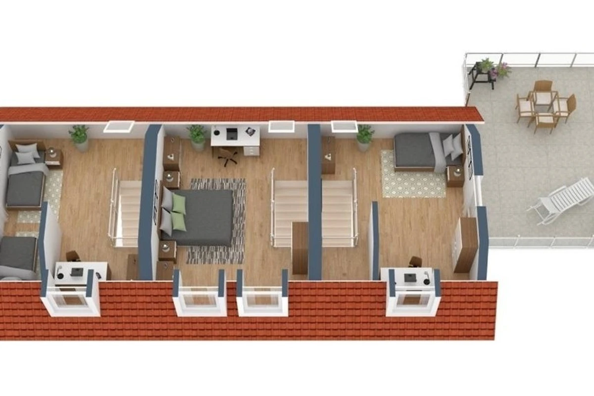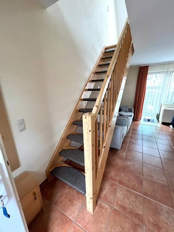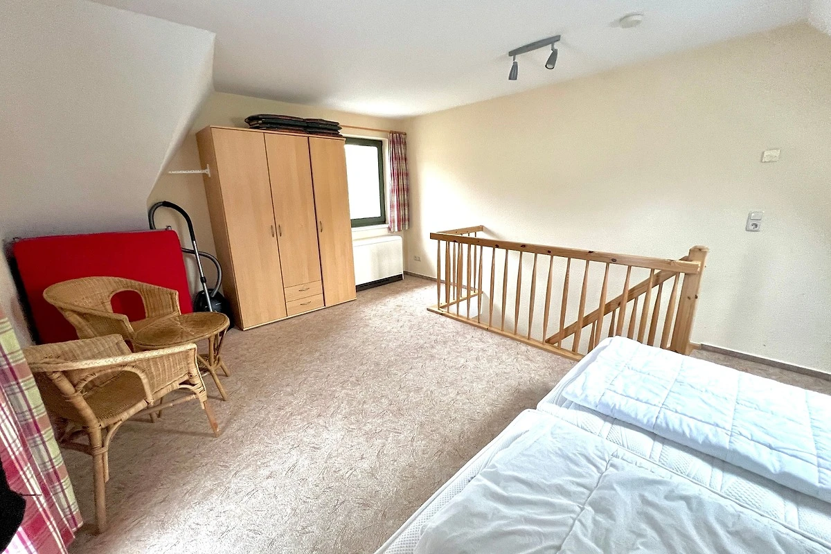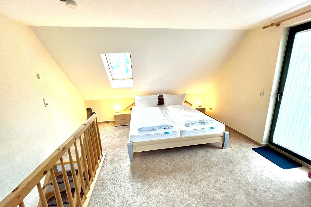 WC mit Duschkabine ist auch unten. Über eine ausreichend breite Treppe geht es in den Schlafbereich. Ein grosszügiges gemütliches Doppelbett und ein bei Bedarf aufklappbares Einzelbett warten hier auf Sie. Der Höhepunkt: Direkt am Schlafzimmer ist ein grosszügiger Balkon mit wunderschönem Meerblick.