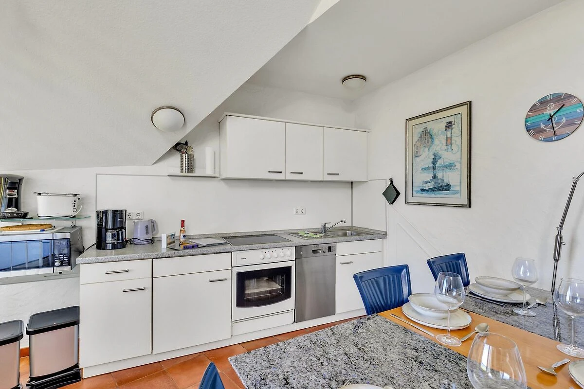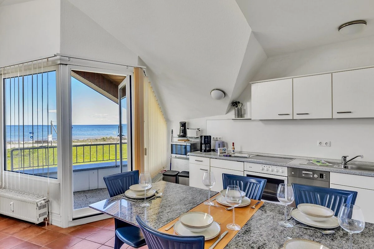 Die lichtdurchflutete Wohnung lädt zu entspannten Stunden ein und in der voll ausgestatten Küche haben Sie die Gelegenheit, sich selbst mit einheimischen Spezialitäten zu versorgen. Im angrenzenden Essbereich finden Sie Platz für gesellige Abende. Ein zweiter Balkon hat ab mittags Sonne bis zum Abend und blickt ebenfalls auf die See.