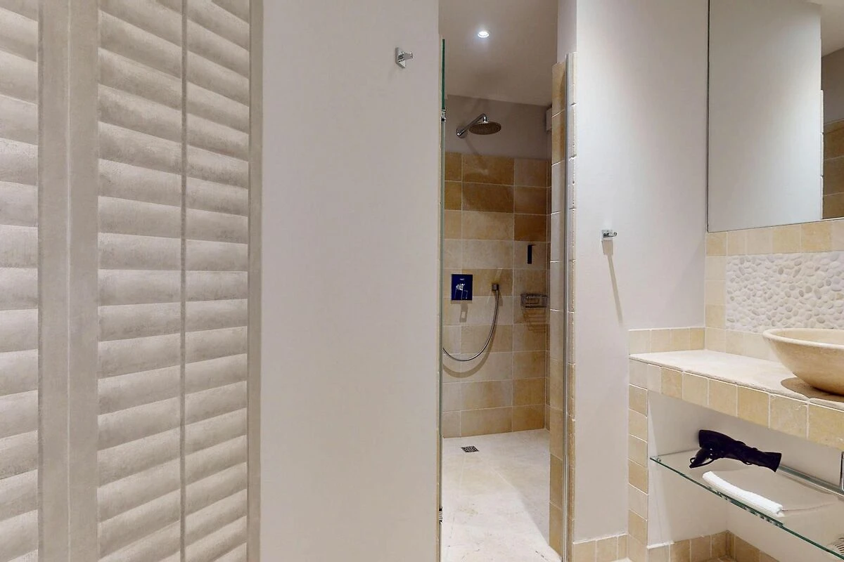 Ebenfalls auf dieser Ebene liegt das moderne Badezimmer mit großzügiger Regendusche.