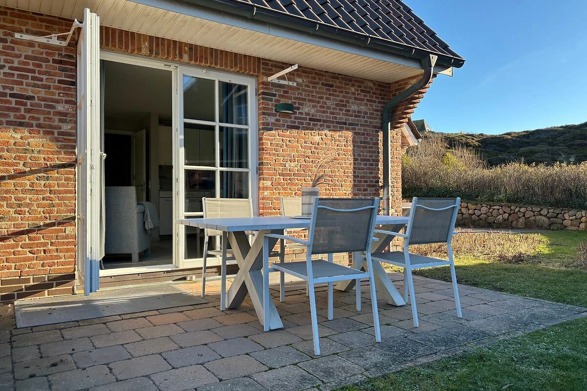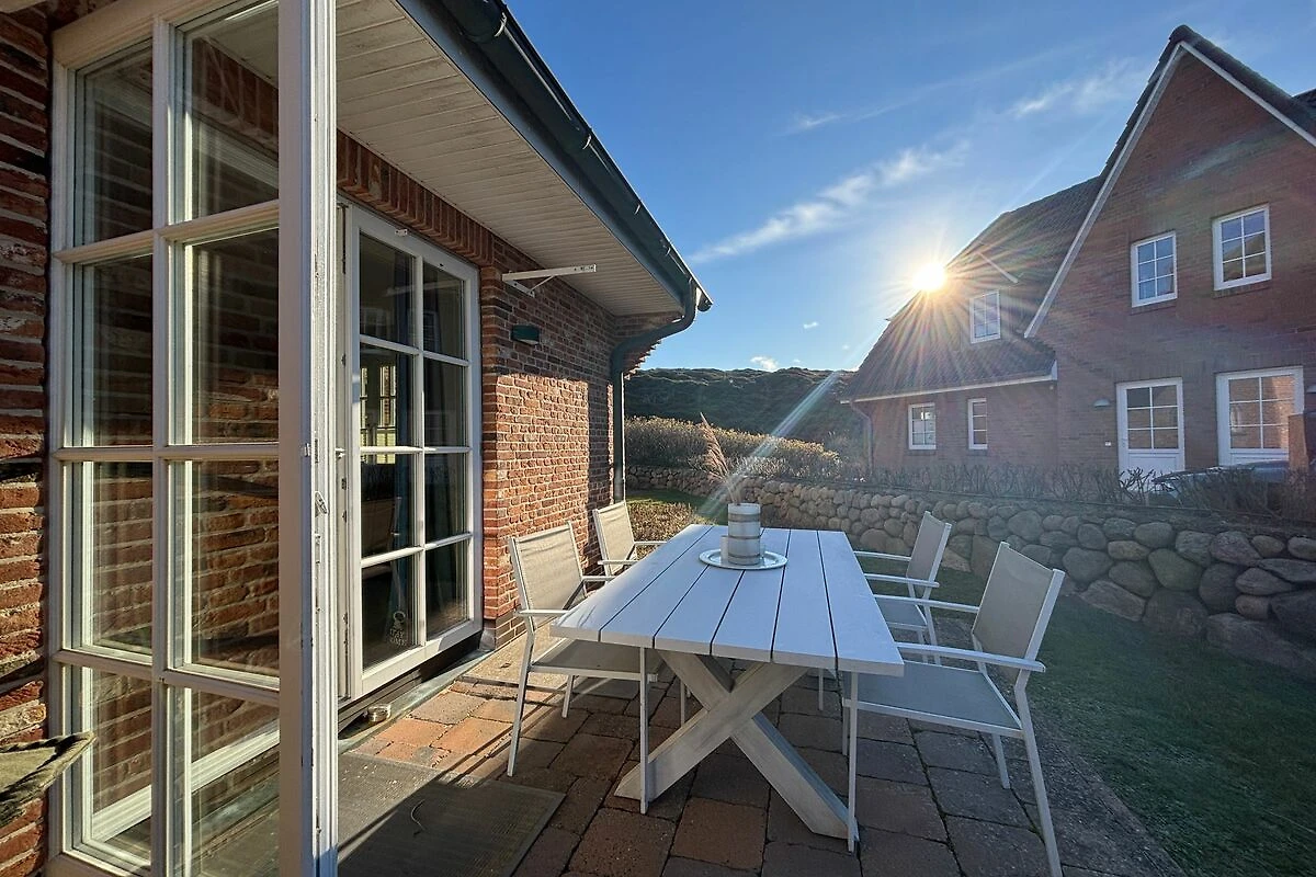Vom Wohnbereich gelangen Sie direkt auf die Terrasse mit Gartenmöbeln und im Sommer eigenem Strandkorb (April – Oktober), perfekt, um in der Sonne zu entspannen oder den Tag bei einem Glas Wein ausklingen zu lassen.