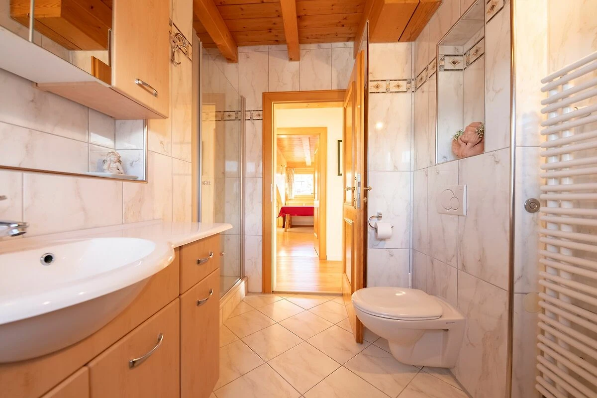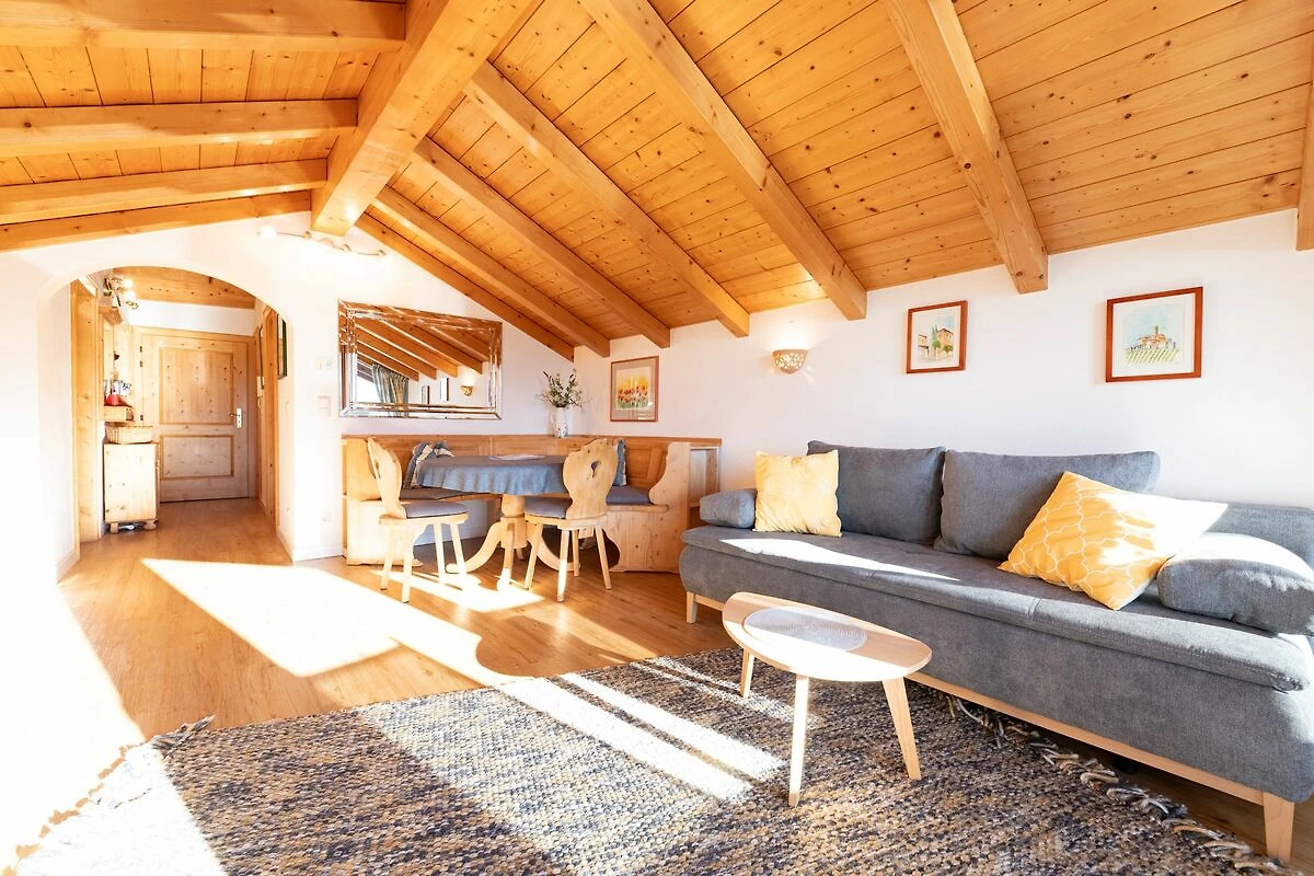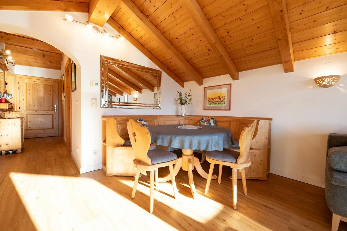 Beim Eintreten erwartet Sie ein warmes, alpenländisches Wohnambiente. Rustikaler Holzboden, hochwertige Holztüren und ein eindrucksvoller sichtbarer Dachstuhl verleihen der Dachgeschosswohnung ihren unverwechselbaren Charme. Die Kombination aus natürlichem Material, gemütlicher Raumaufteilung und liebevollen Details schafft eine besonders einladende Atmosphäre.