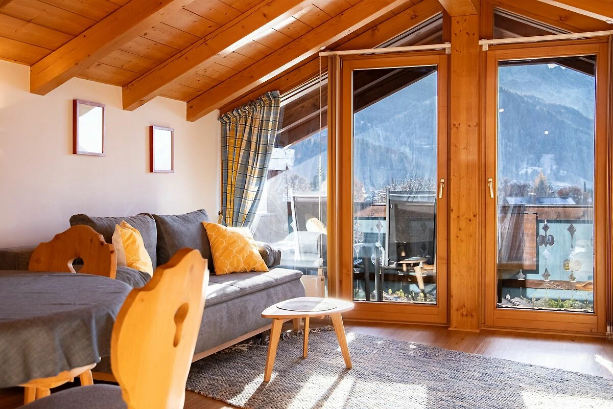 Der helle Wohn- und Essbereich bildet das Herz dieser rund 55 m² großen Ferienwohnung. Die großzügige Glasfront sorgt für viel Tageslicht und eröffnet einen herrlichen Blick auf die umliegenden Berge – ein echtes Highlight für Ihren Urlaub. Vom Wohnbereich aus gelangen Sie auf den überdachten Balkon, der mit bequemen Sitzmöbeln ausgestattet ist und sowohl morgens als auch abends einen traumhaften Ausblick bietet. Hier können Sie entspannte Stunden verbringen, die frische Bergluft genießen oder den Tag mit einem Glas Wein ausklingen lassen. Ein komfortables Sofa, eine gemütliche Eckbank sowie ein TV sorgen im Wohnraum für zusätzlichen Komfort und laden zu erholsamen Abenden ein.
