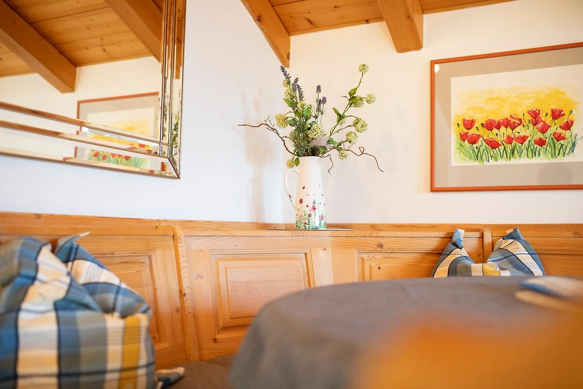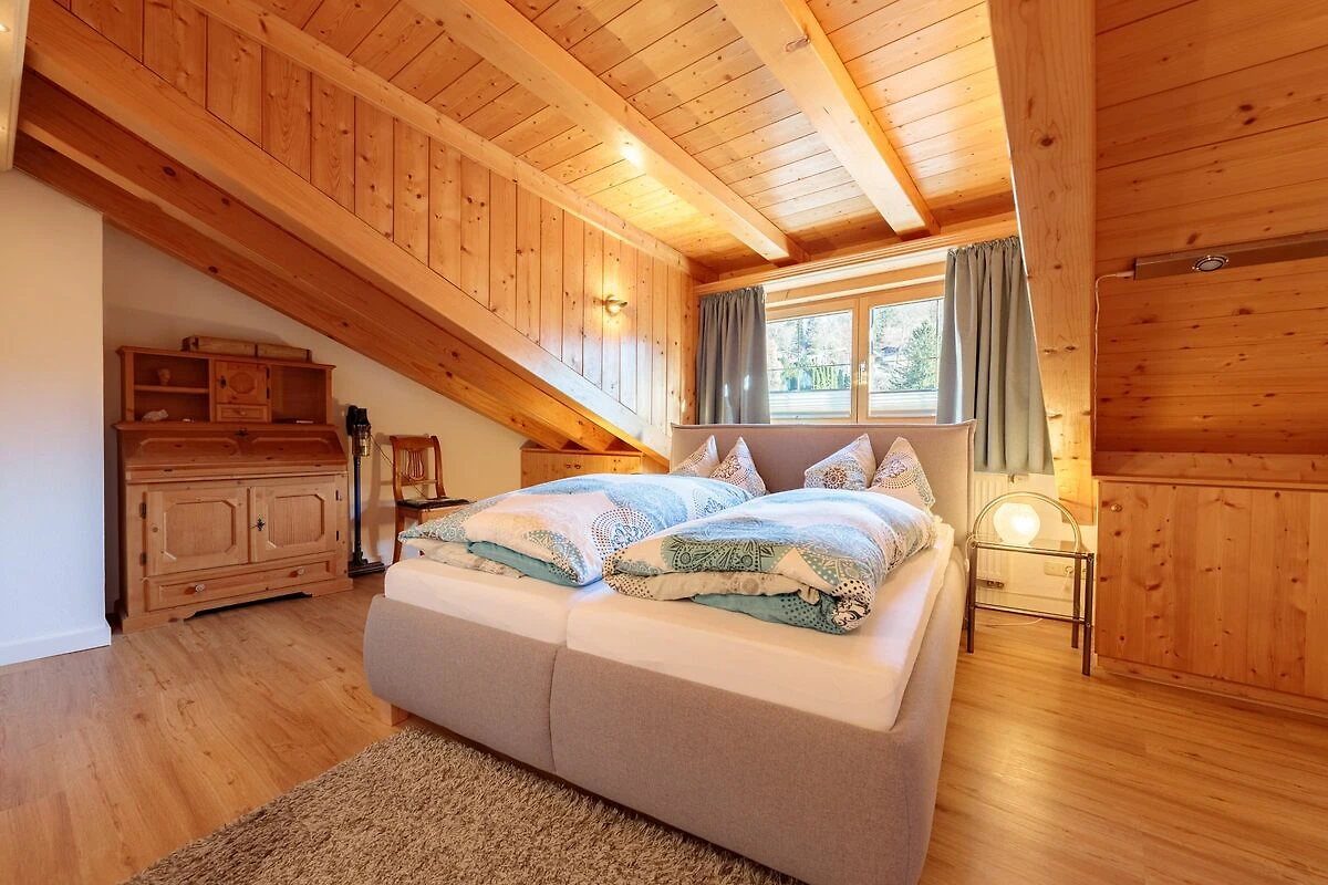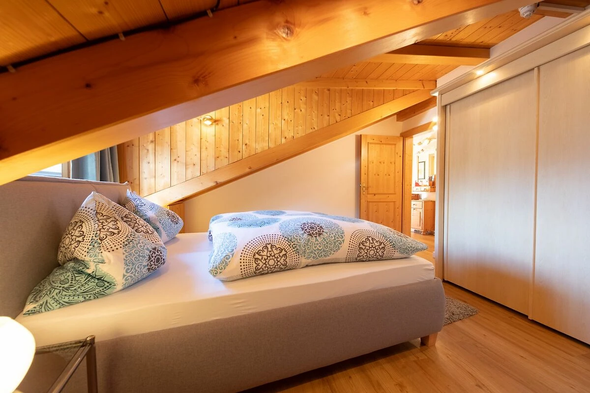 Das Schlafzimmer strahlt mit seinen vielen Holzelementen eine besonders behagliche Atmosphäre aus. Ein komfortables Doppelbett sowie ein geräumiger Kleiderschrank bieten alles, was Sie für erholsame Nächte benötigen. Insgesamt stehen in der Ferienwohnung drei Schlafmöglichkeiten zur Verfügung, sodass sich die Unterkunft sowohl für Paare als auch für kleine Familien optimal eignet.
