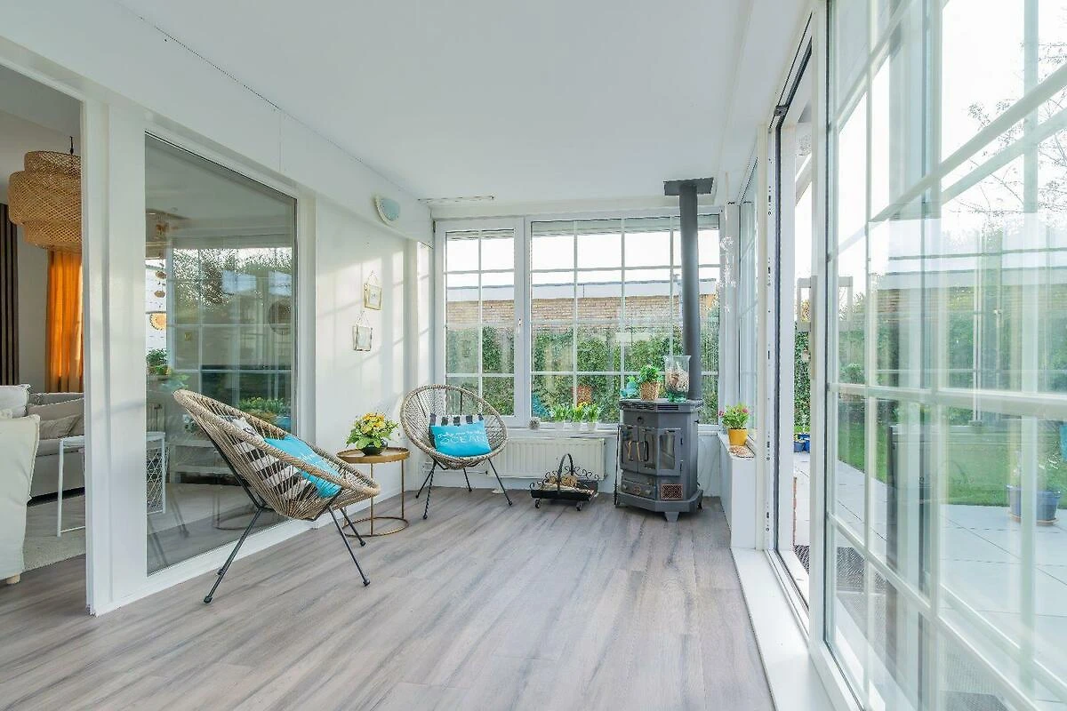 Wenn Sie eintreten, gelangen Sie direkt in das gemütliche Wohnzimmer mit einer einladenden Sitzecke. Dieser Bereich geht nahtlos in den Wintergarten mit Kaminofen über. Hier können Sie sich am knisternden Feuer mit einem Buch oder einem Getränk wunderbar entspannen. An den Wohnbereich schließt sich die offene Küche an, die mit allem Komfort ausgestattet ist.