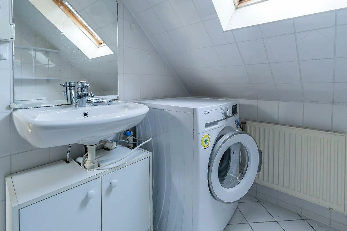 Über die Treppe im Flur gelangen Sie in den offenen Bereich im Obergeschoss, wo ein Einzelbett und ein Schreibtisch stehen. Darüber hinaus gibt es ein zweites Schlafzimmer mit Doppel-Boxspringbett sowie ein Badezimmer, das mit Dusche, Waschbecken, Toilette und einer Waschmaschine ausgestattet ist – ideal für einen längeren Aufenthalt.