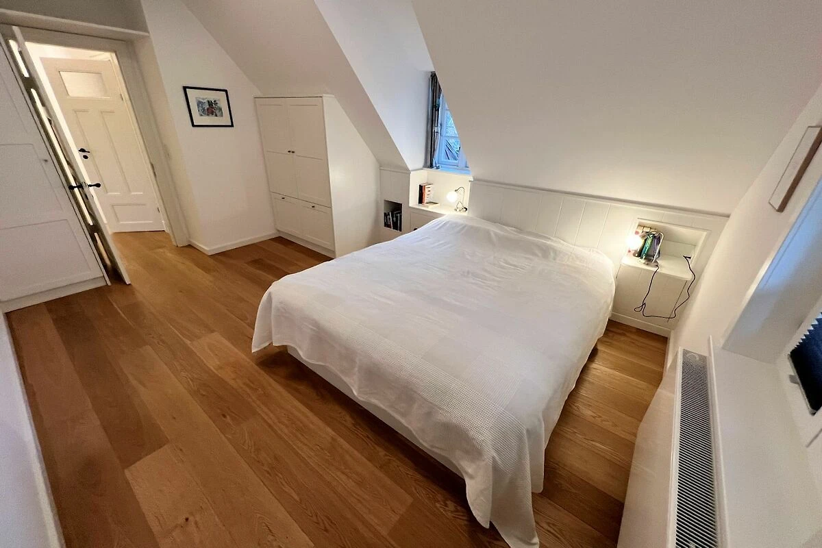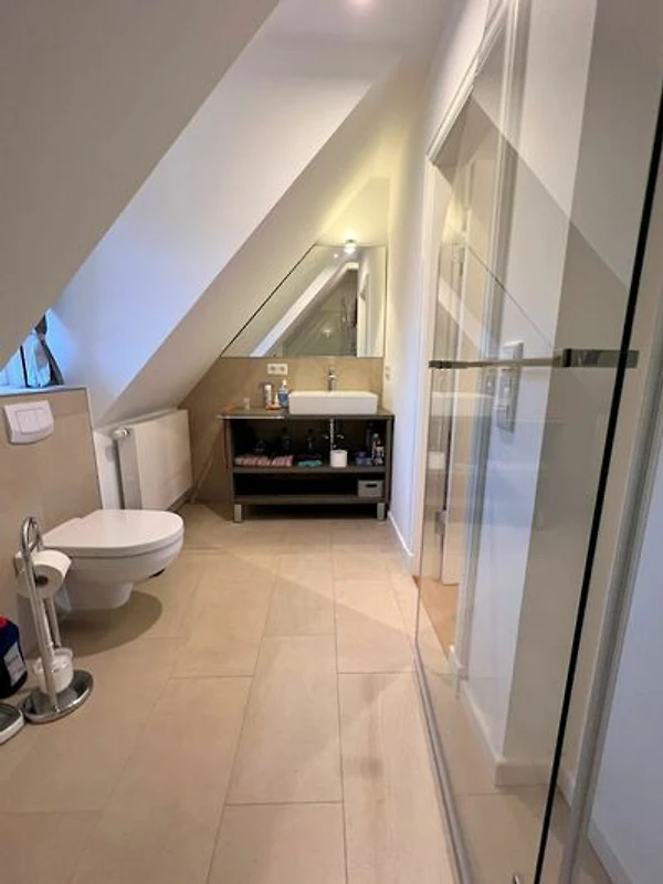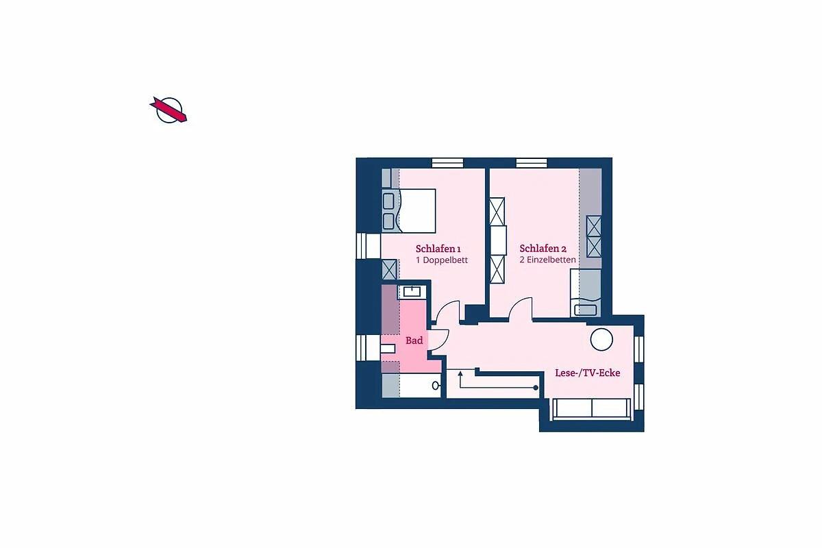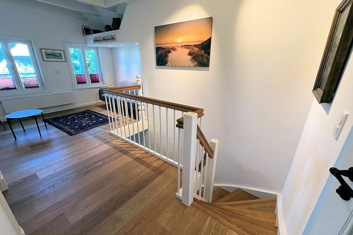 Im Obergeschoss sind die beiden Schlafzimmer - eines mit einem Doppelbett (160x200) und eines mit zwei Einzelbetten (90x200 und 120x200) -, ein zweites Duschbad sowie eine Lese-/TV-Ecke gelegen.