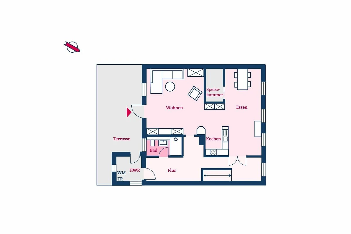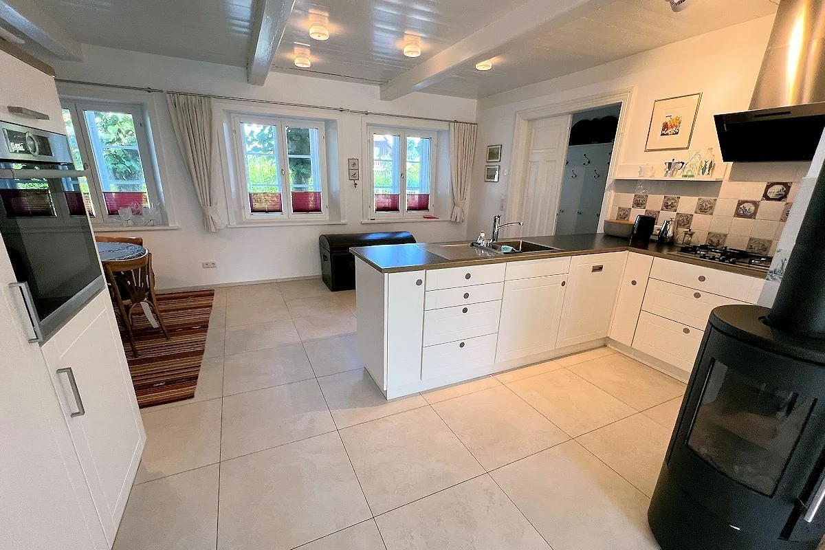 Im Erdgeschoss befinden sich der großzügige Wohn- und Essbereich mit offener Küche, eine separate Speisekammer, ein Duschbad und der Hauswirtschaftsraum sowie ein geräumiger Flur. Über den Wohnbereich gelangen Sie direkt auf die Südterrasse und in den Garten. Der dänische Eisenofen im Wohnbereich sorgt auch an kühleren Tagen für eine angenehme Atmosphäre.