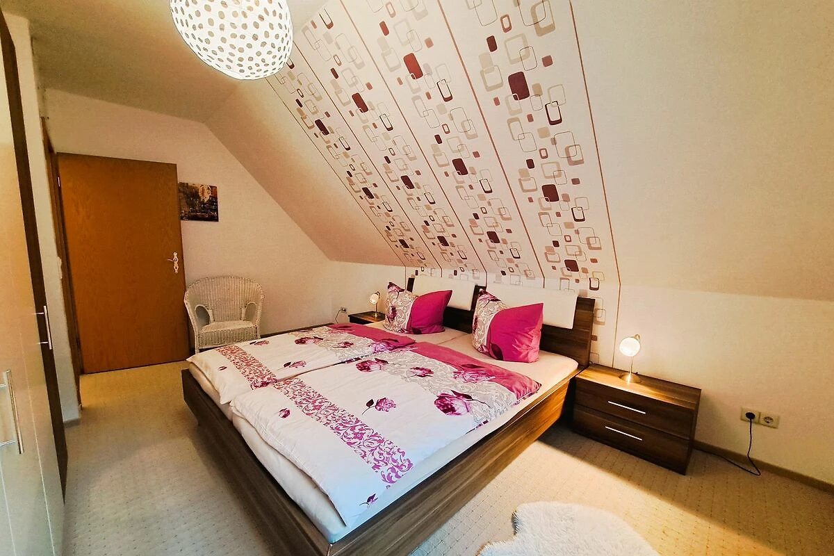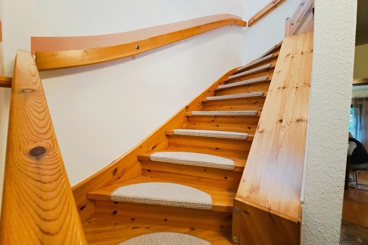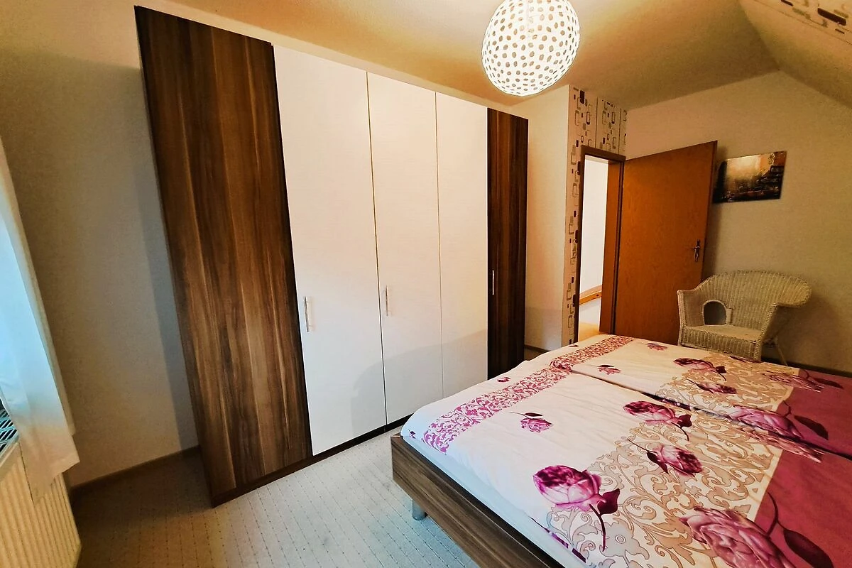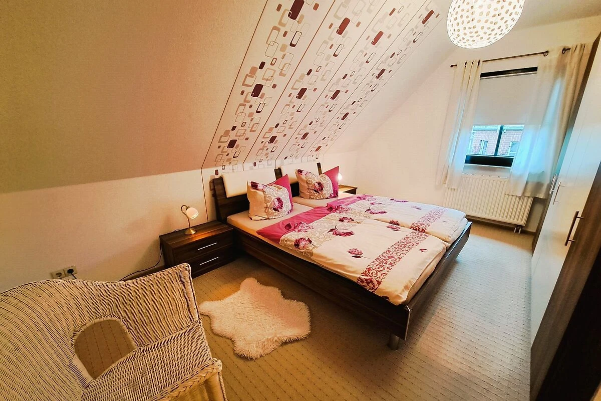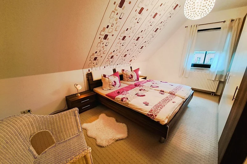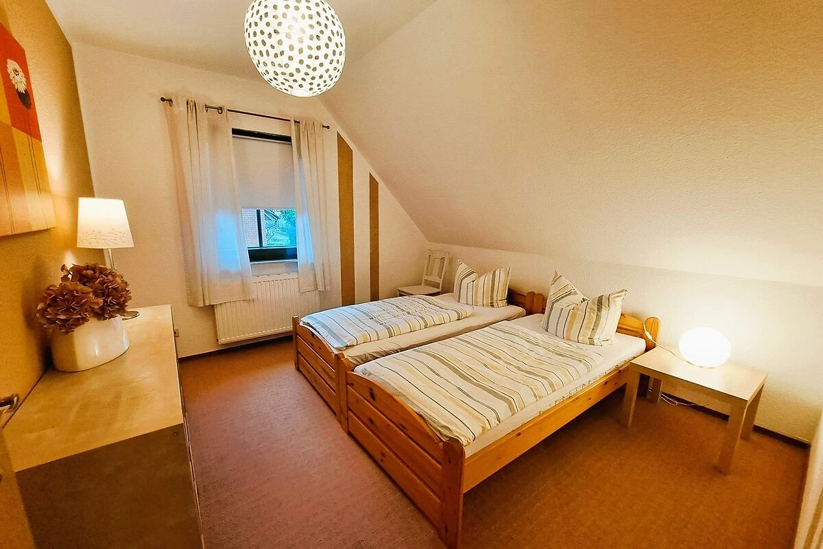 Nun führt Sie eine Treppe hinauf in das Obergeschoss der Wohnung. Dort erwarten Sie zwei liebevoll eingerichtete Schlafzimmer, die mit zusammenstehenden Einzelbetten, einem Kleiderschrank und Nachttischen ideal für erholsame Nächte und entspannte Urlaubstage. Zusätzlich steht Ihnen auf dieser Etage ein Gäste-WC zur Verfügung.