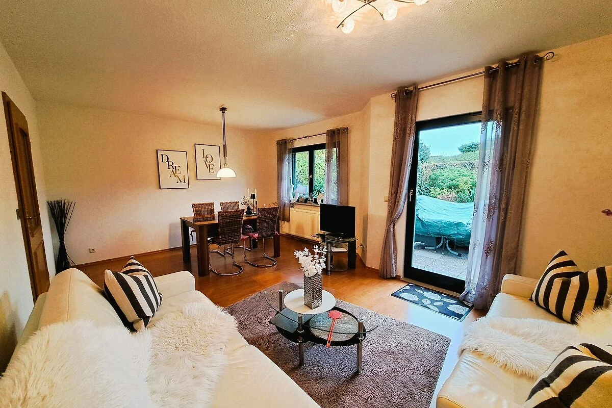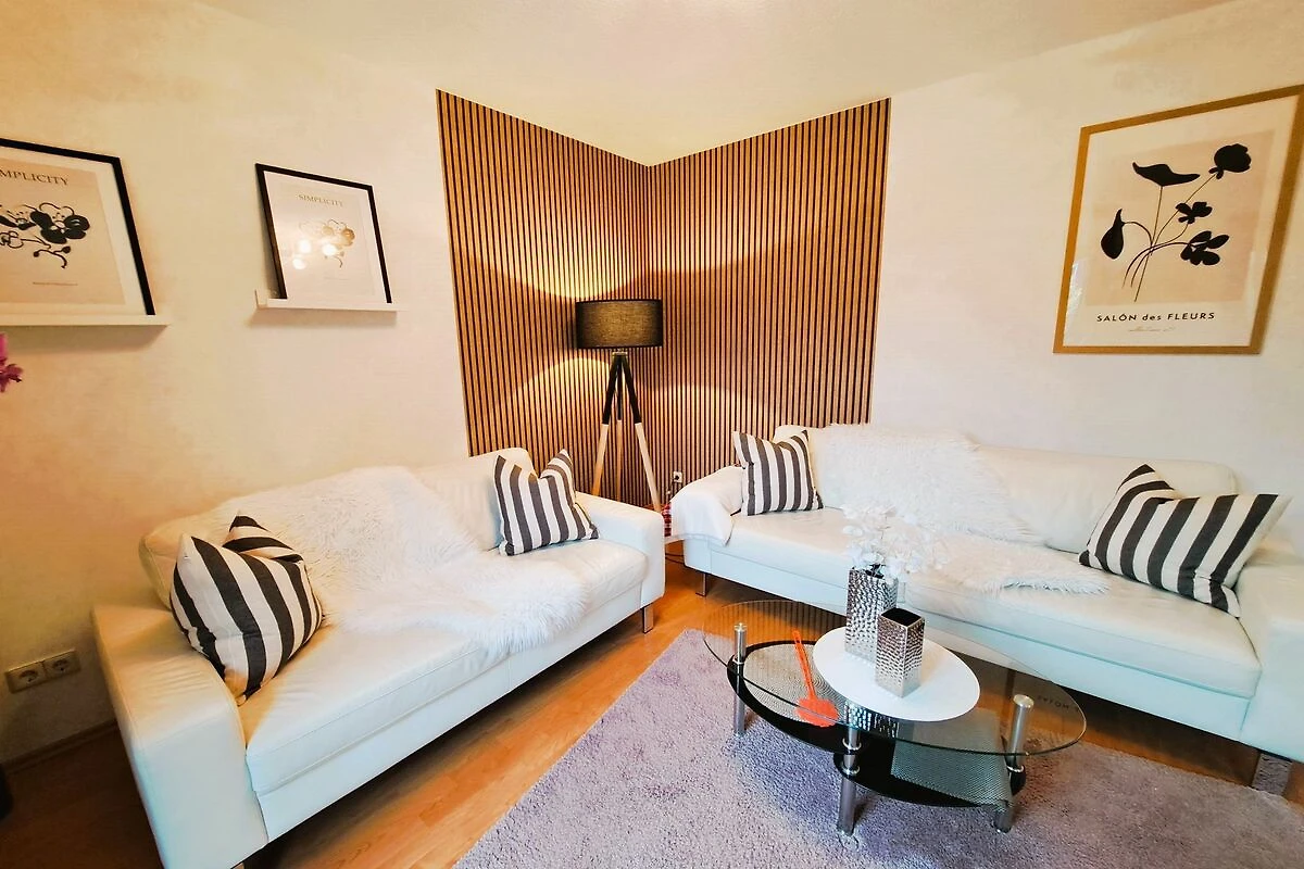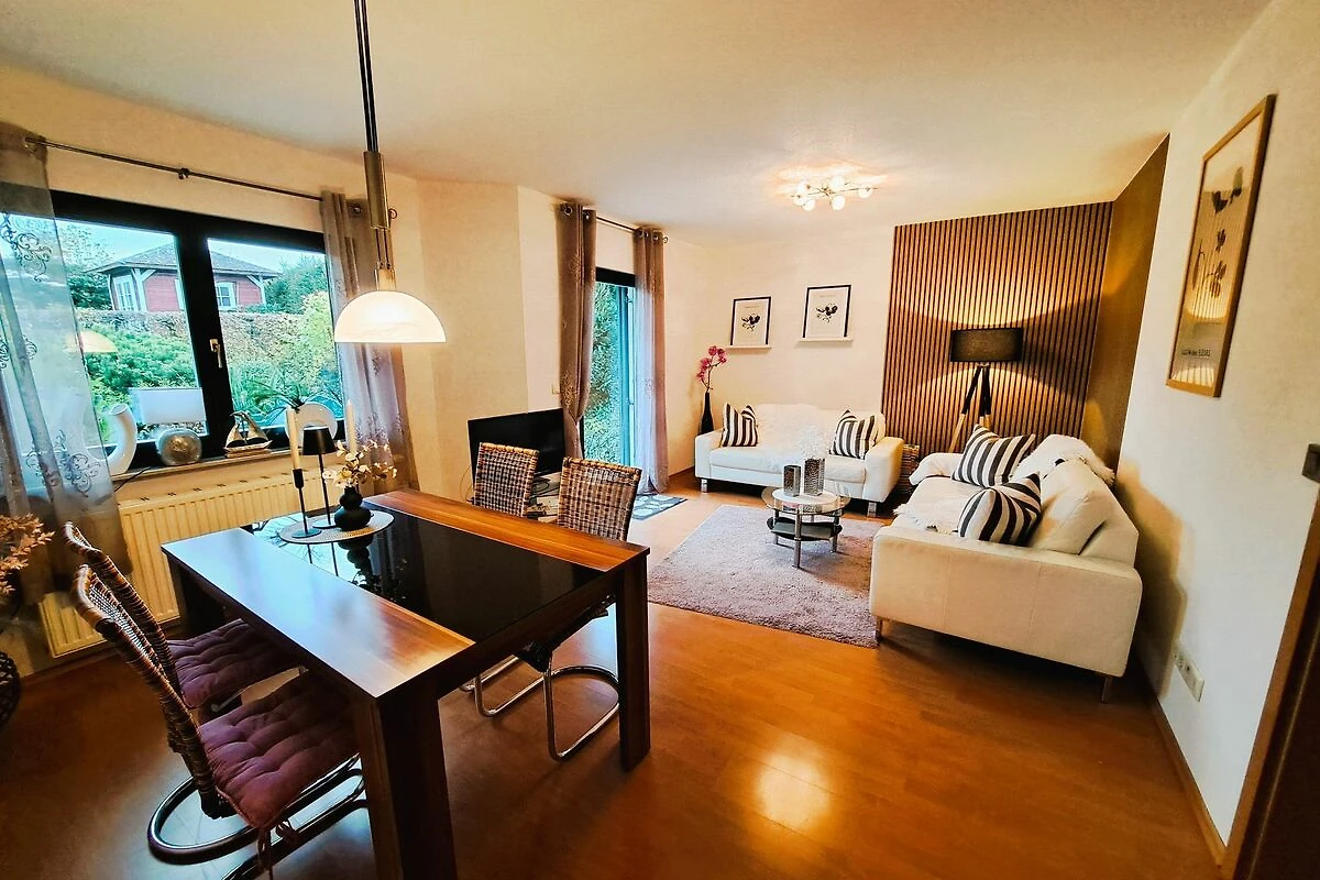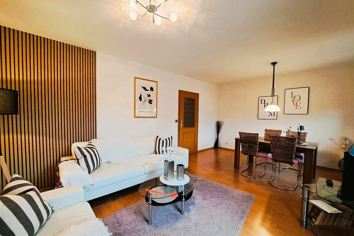 Am Ende des Flures öffnet sich das Herzstück der Wohnung: das einladende Wohnzimmer. Hier laden eine grosse, bequeme Couchlandschaft und der Esstisch für bis zu vier Personen zum Verweilen ein. Ob gemeinsames Essen, ein geselliger Spieleabend oder gemütliches Fernsehen dank Flachbild-TV und Gesellschaftsspielen kommt keine Langeweile auf.