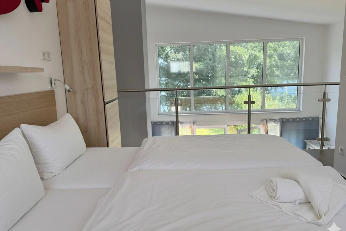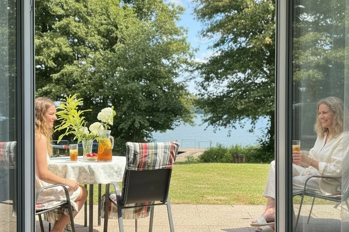 Lichtdurchflutete Glasfronten öffnen den Blick über den glitzernden See bis zum Aussichtsturm am gegenüberliegenden Ufer. Das sanfte Plätschern an der Badestelle vor den Terrassen, das Knistern des Kamins am Abend und der Sternenhimmel über dem Steg schaffen einen Ort, an dem Natur, Entspannung und Leichtigkeit miteinander verschmelzen.