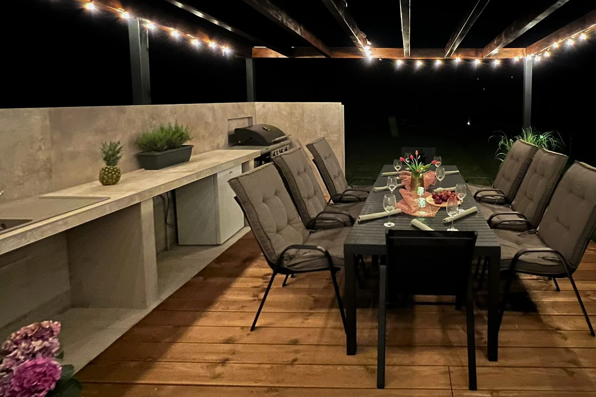 Die moderne Küche bietet alles, was für die Zubereitung von Mahlzeiten benötigt wird. Gäste können ihre Mahlzeiten im Essbereich oder auf der überdachten Terrasse im Freien genießen.
