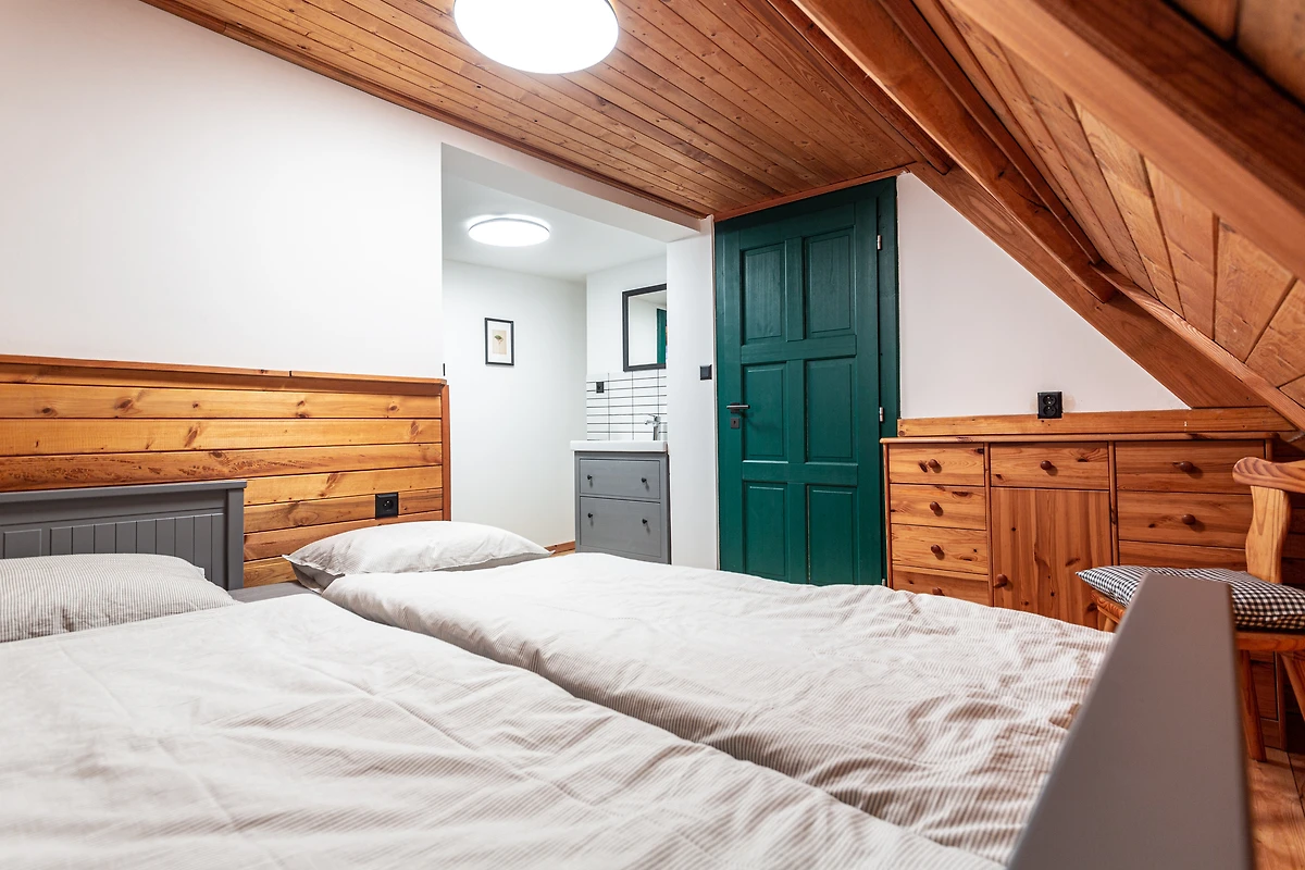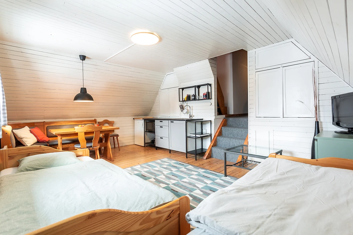 • Schlafzimmer 5 – Geräumiger Raum (22 m²) mit eigener ausgestatteter Küche und Schlafboden. Kapazität: 5 Einzelbetten