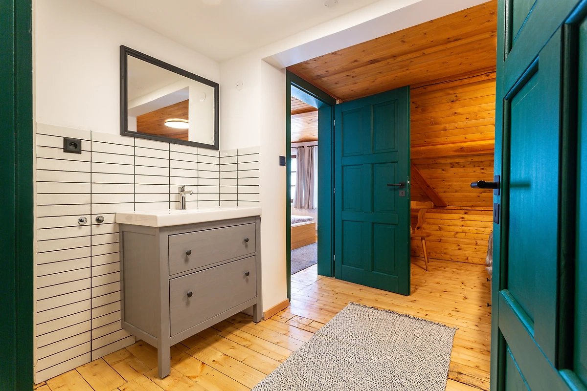 Im Erdgeschoss der Hütte befindet sich eine großzügige Eingangshalle mit Abstellmöglichkeiten für Sportausrüstung. Außerdem gibt es ein Wohnzimmer mit Kaminofen sowie eine voll ausgestattete Küche. Im Erdgeschoss befinden sich auch zwei Badezimmer mit WC und Dusche sowie eine separate Toilette.
