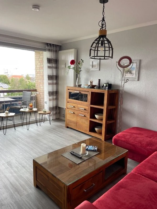 Im hellen und geräumigen Wohnzimmer finden Sie ein Ecksofa mit Schlaffunktion für 2 Personen, TV, einen Essbereich für 4 Personen und Ausblick über die Dächer von Büsum, sowie den Zugang zum Balkon mit seitlichem Meerblick.