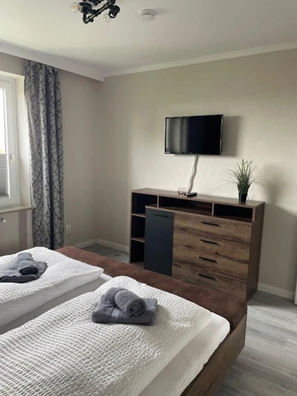 Das Schlafzimmer verfügt über ein Doppelbett, TV und ausreichend Platz, um ein zusätzliches Kindereisebett (kostenfrei zubuchbar) aufzustellen.