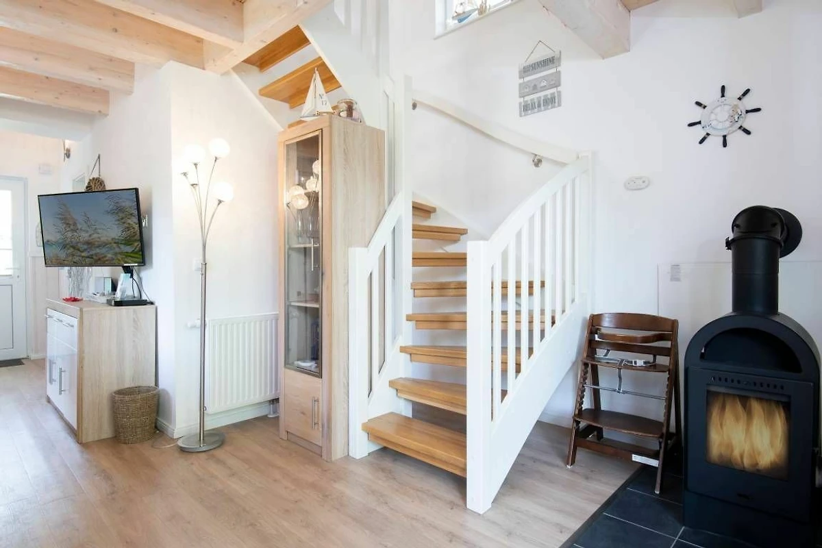 Im hellen, liebevoll eingerichteten Wohnzimmer erwartet Sie ein knisternder Kaminofen – ideal für gemütliche Abende, wenn draußen die Wellen rauschen. Die moderne Sofaecke und das Schlafsofa (140x200) bieten nicht nur Komfort, sondern schaffen einen Ort, an dem man sich sofort wohlfühlt. Ein Smart-TV, Radio und CD-Spieler runden das Entertainment-Angebot stilvoll ab.