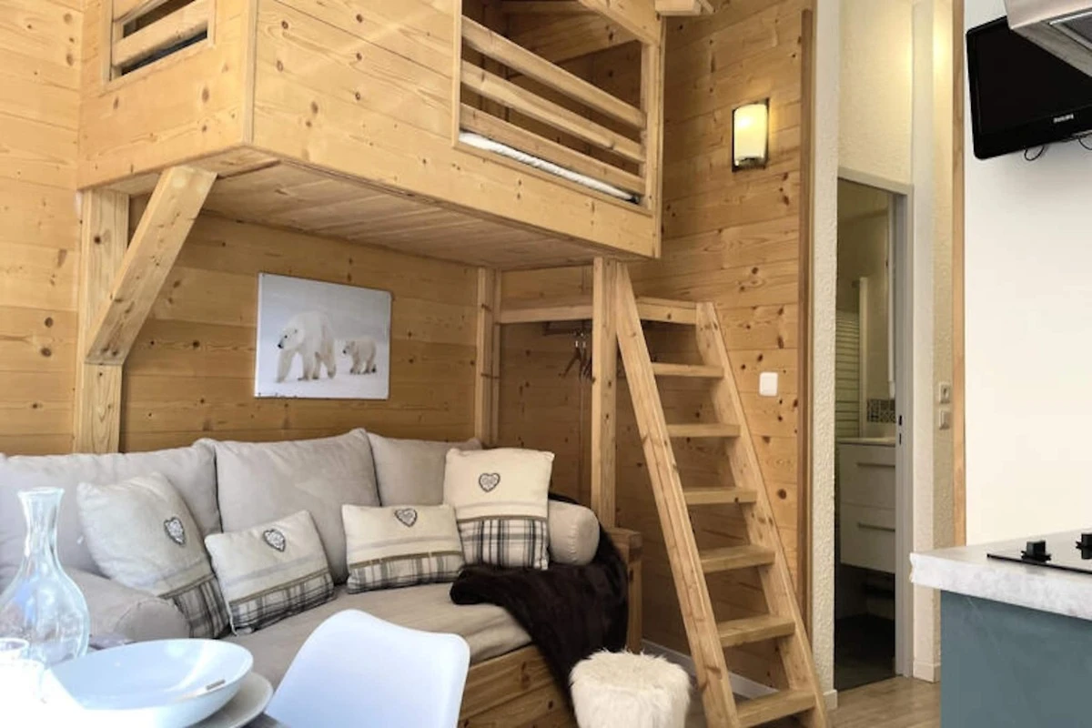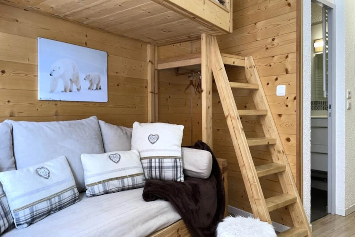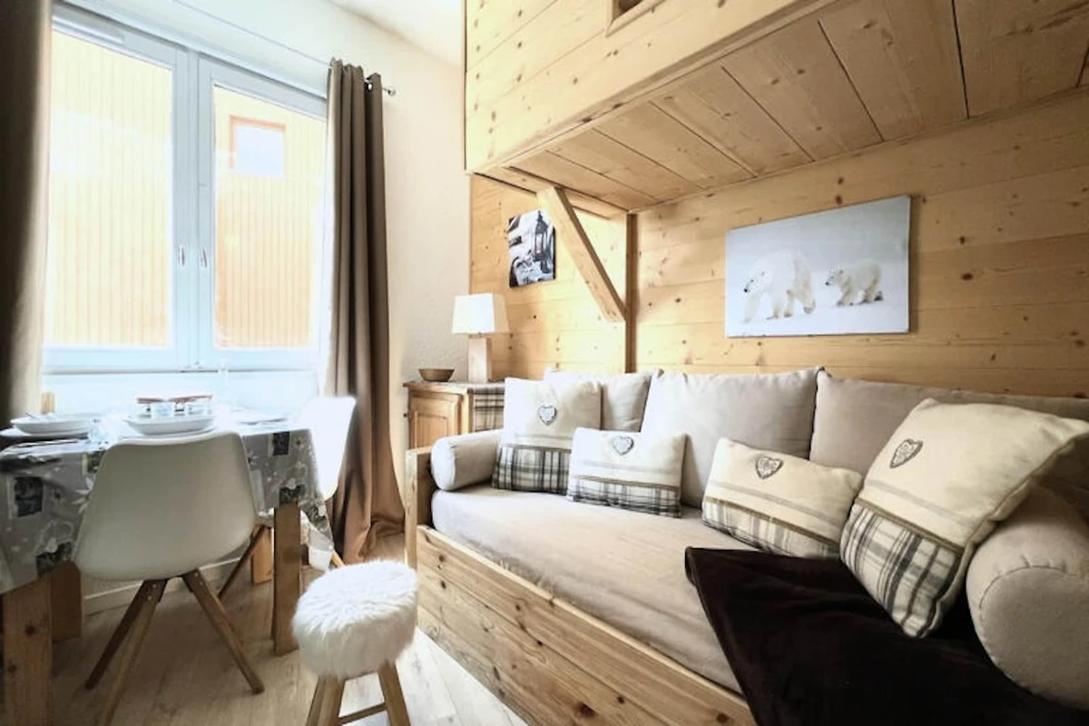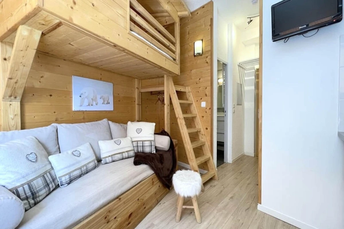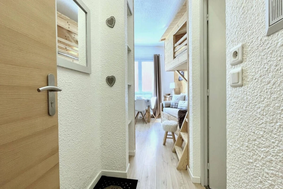 Mitten in Les Menuires bietet dieses charmante 19 m² große Apartment in der Residenz Boedette A einen gemütlichen Rückzugsort in den Bergen für bis zu drei Gäste. Die perfekte Lage direkt an den Skipisten sorgt für unvergleichlichen Komfort für Wintersportbegeisterte. Die Residenz selbst verfügt über moderne Annehmlichkeiten wie einen Aufzug und private Skischränke, die einen reibungslosen und stressfreien Aufenthalt in den Bergen garantieren. Treten Sie vor die Tür und Sie befinden sich direkt auf den Pisten und können den Nervenkitzel des Skigebiets Trois Vallées in vollen Zügen genießen. \n\nDas Apartment wurde liebevoll im warmen Chalet-Stil renoviert und vereint rustikalen Charme mit funktionalem Design. Der Wohnbereich bietet ein bequemes Schlafsofa und ein Ausziehbett (beide 80 x 190 cm) sowie ein gemütliches Hochbett (75 x 185 cm) und ist somit ideal für Paare oder kleine Familien. Die voll ausgestattete Küchenzeile umfasst ein Cerankochfeld, einen Kühlschrank, eine Mikrowelle, einen Backofen, einen Geschirrspüler und alles, was Sie für die Zubereitung leckerer Mahlzeiten nach einem Tag auf der Piste benötigen. Das Badezimmer verfügt über eine entspannende Badewanne und ein separates WC für zusätzlichen Komfort. Obwohl das Apartment kein WLAN bietet, machen die gemütliche Atmosphäre und die durchdachten Annehmlichkeiten es zu einem wunderbaren Rückzugsort vom Alltag. Les Menuires ist ein lebendiger Ort mit einer Fülle an Aktivitäten und Attraktionen abseits des Skifahrens. Von malerischen Wanderwegen im Sommer bis hin zu lebhaften Après-Ski-Angeboten im Winter – hier ist für jeden etwas dabei. Die nahegelegenen Geschäfte, Restaurants und Skischulen sorgen dafür, dass Sie alles Notwendige bequem erreichen. Ob Sie nun im Tiefschnee Ihre Schwünge ziehen oder einfach nur die atemberaubende Alpenkulisse genießen möchten – dieses Apartment ist Ihr Tor zu einem unvergesslichen Bergabenteuer.