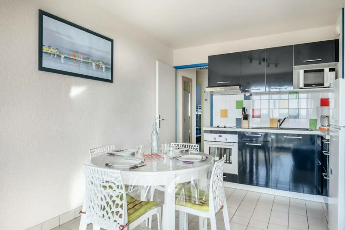 Mit Blick auf das glitzernde Wasser des Atlantiks lädt dieses charmante Apartment in Le Croisic Sie ein, in die natürliche Schönheit der Halbinsel Guérande einzutauchen. Erwachen Sie zum sanften Rauschen der Wellen und genießen Sie Ihren Morgenkaffee auf der privaten Terrasse mit atemberaubendem Meerblick. Ob Sie Ruhe und Entspannung suchen oder ein aktives Abenteuer am Meer erleben möchten – diese Oase an der Küste ist der perfekte Ort für unvergessliche Erinnerungen. Das 40 m² große Apartment bietet Platz für bis zu 4 Gäste und verfügt über zwei gemütliche Schlafzimmer, eine voll ausgestattete amerikanische Küche und einen hellen Wohnbereich mit Zugang zur Terrasse. Moderne Annehmlichkeiten wie WLAN, Fernseher, Waschmaschine und eine Garage sorgen für einen komfortablen und bequemen Aufenthalt. Die Küche ist mit allem ausgestattet, was Sie benötigen – vom Backofen und der Mikrowelle bis hin zur Tassimo-Kaffeemaschine und dem Toaster – sodass Sie nach einem erlebnisreichen Tag im Handumdrehen köstliche Mahlzeiten zubereiten können. Nur 200 Meter vom Sandstrand Plage de la baie du Sable entfernt, ist das Apartment ideal für Strandliebhaber gelegen. Nur wenige Schritte entfernt liegt die charmante Crêperie Le Stream, und das lebhafte Stadtzentrum von Le Croisic erreichen Sie nach nur 1 km. Für Familienausflüge bietet sich der Wasserpark Océarium du Croisic an, der nur 3 km entfernt ist. Der nahegelegene Küstenwanderweg GR 34 lädt zu atemberaubenden Wanderungen entlang der zerklüfteten Küste ein. Golfliebhaber können auf dem nur 11 km entfernten Golfplatz Golf de Guérande abschlagen, und Naturfreunde werden vom nahegelegenen Parc naturel régional de Brière begeistert sein.