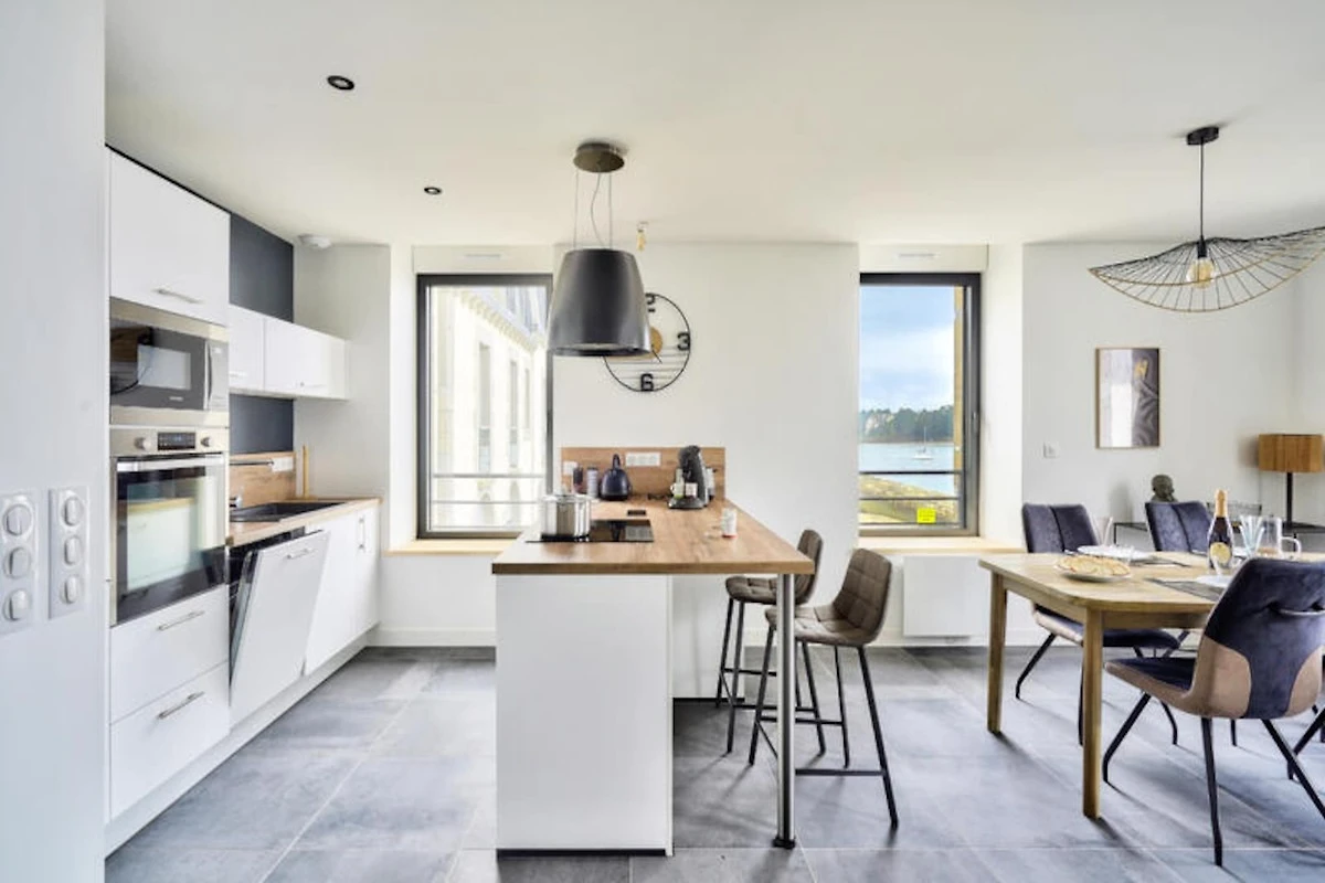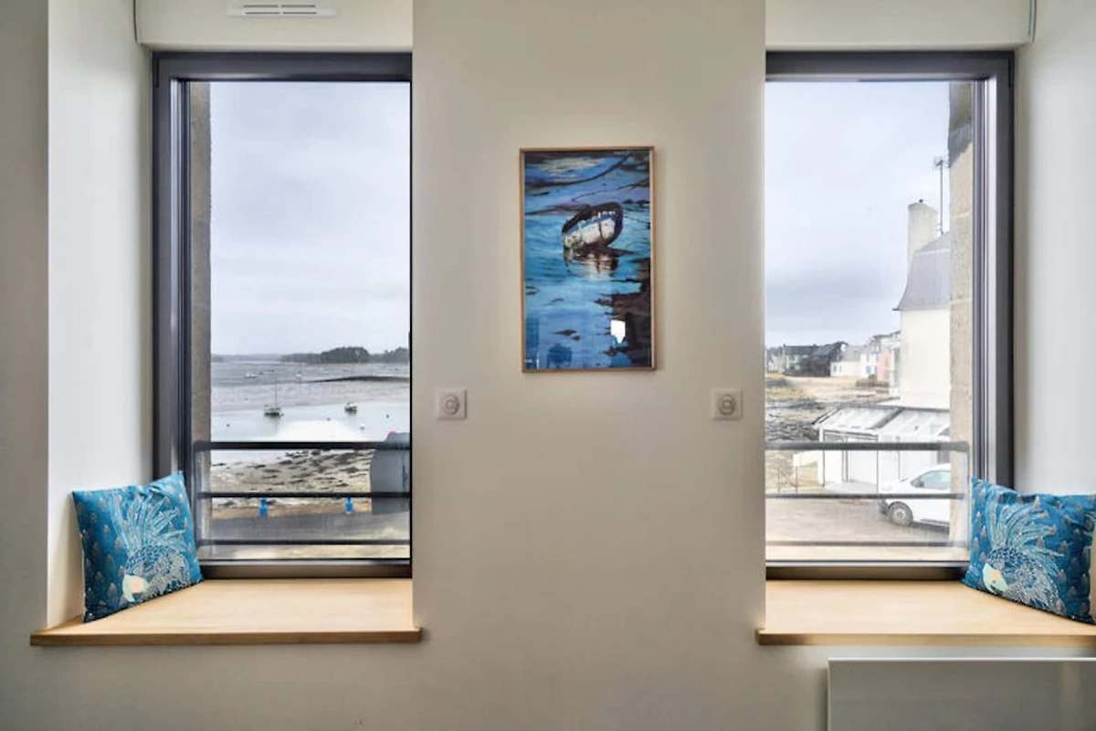 Auf der malerischen Halbinsel Île-Tudy bietet dieses atemberaubende 98 m² große Apartment einen unvergleichlichen Rückzugsort mit einem atemberaubenden 180°-Panoramablick auf Meer und Fluss. Vom Sonnenaufgang bis zum Sonnenuntergang taucht das sich ständig verändernde Licht die Landschaft in ein bezauberndes Panorama, das Ihre Sinne verzaubern wird. Tauchen Sie ein in den Charme dieses ehemaligen Fischerdorfes, wo die authentische bretonische Atmosphäre und der entspannte Rhythmus des Küstenlebens eine idyllische Kulisse für Ihren Urlaub schaffen. Feine Sandstrände, urige Bars und einladende Restaurants sind bequem zu Fuß erreichbar und machen jeden Moment zu einem Genuss.