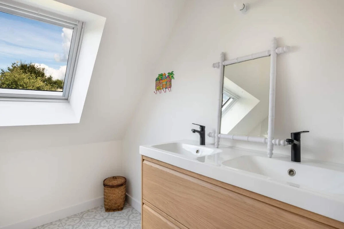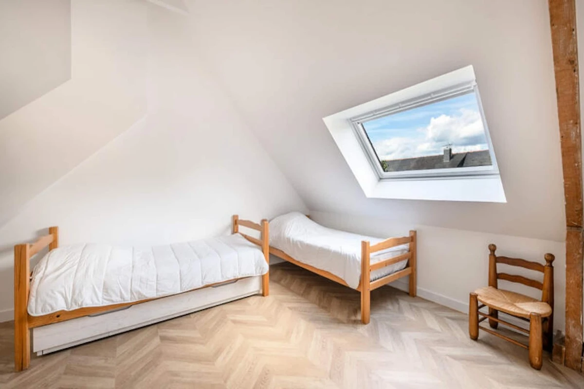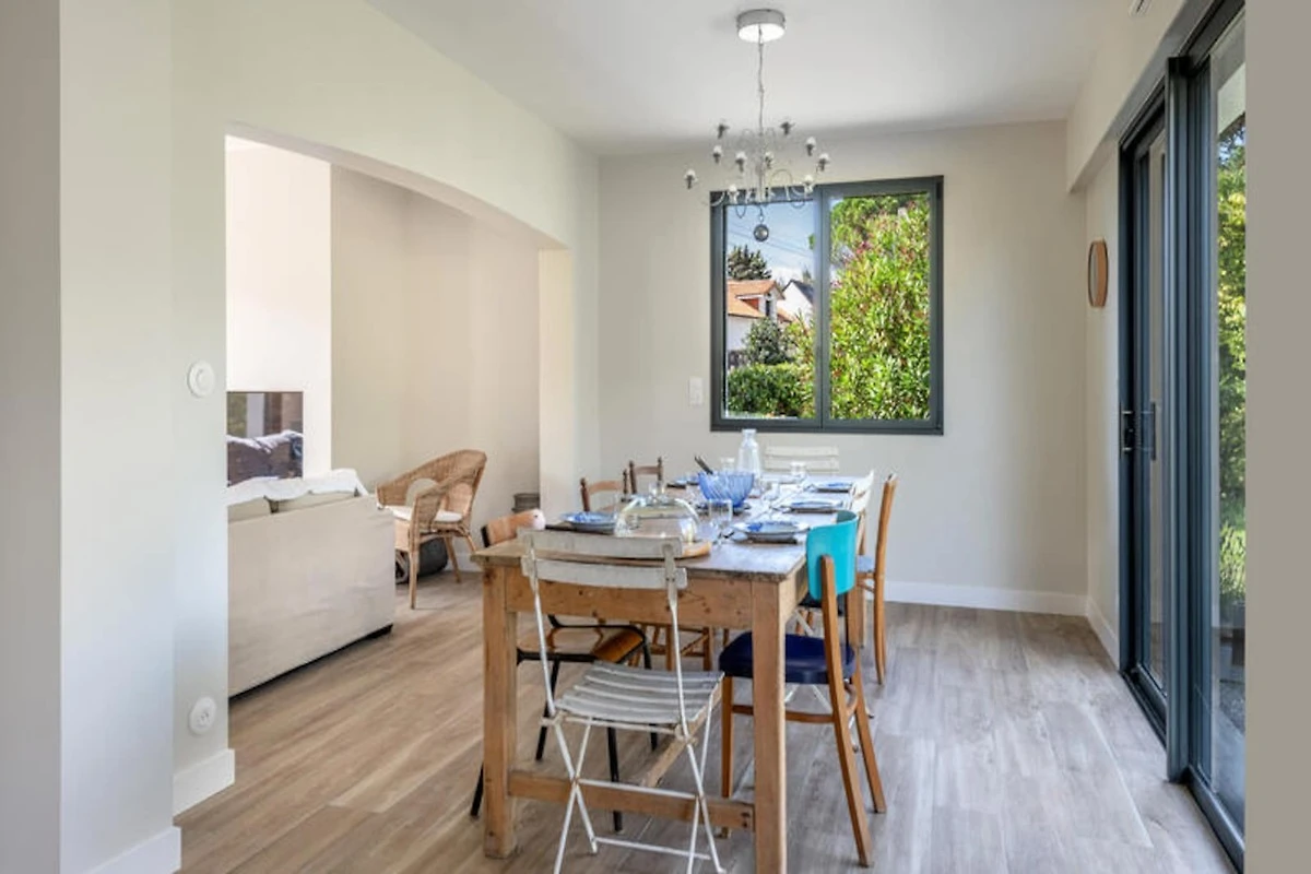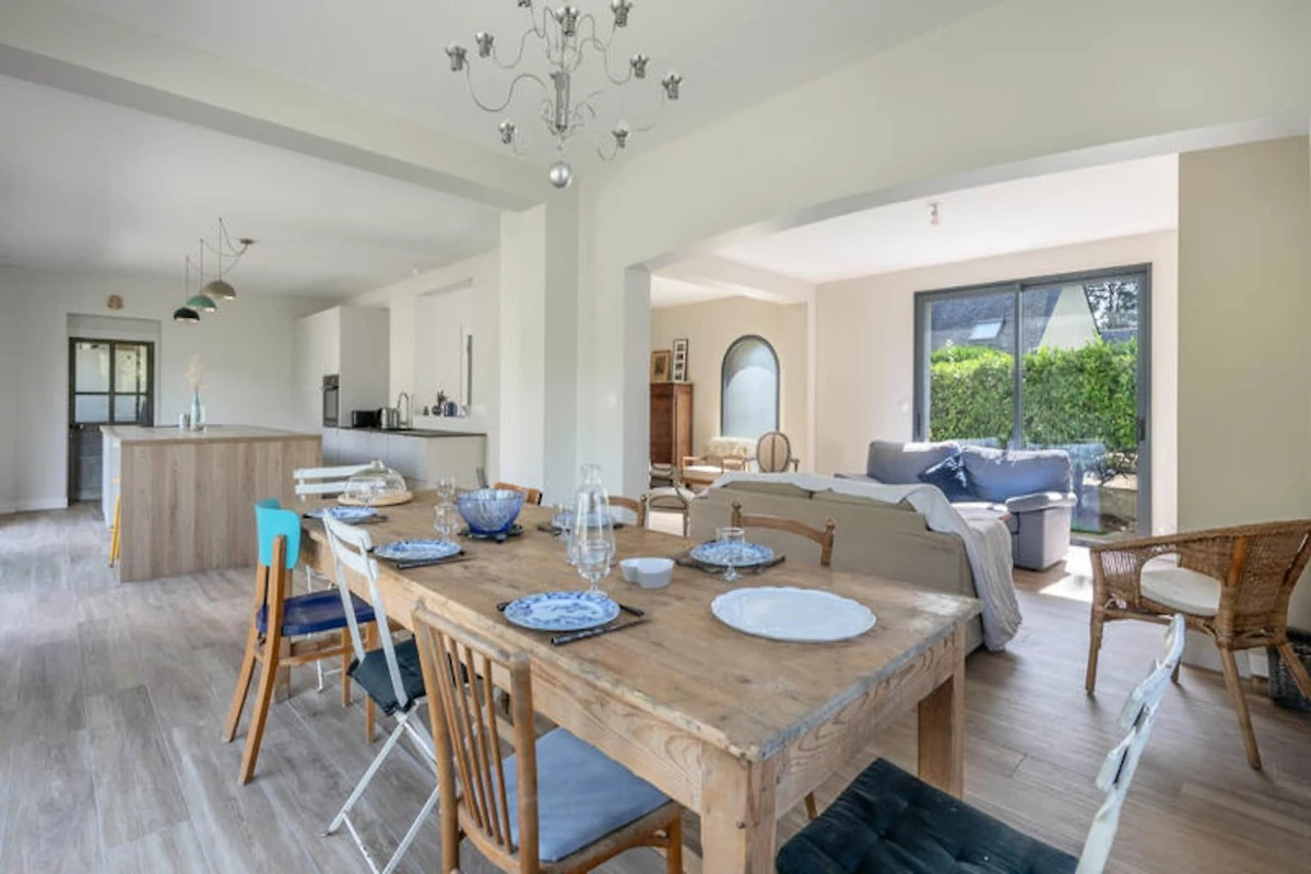 An der glitzernden Côte d'Amour lädt dieses geräumige Familienhaus zu einem perfekten Urlaub am Meer ein. Umgeben von einem geschützten Garten bietet das Anwesen Ruhe und Privatsphäre und ist somit ideal für Familien oder Gruppen, die unvergessliche Momente miteinander verbringen möchten. Mit Platz für bis zu 9 Erwachsene, 3 Kinder und ein Baby sorgt das durchdachte Design des Hauses für Komfort und Entspannung für alle. Stellen Sie sich Morgenstunden mit einer Tasse Kaffee auf der Terrasse, Nachmittage mit Erkundungstouren an den nahegelegenen Stränden und Abende voller Lachen am Esstisch vor. Hier entstehen Erinnerungen. \n\nIm Inneren des 190 m² großen Hauses erwartet Sie ein moderner Wohnbereich mit geschmackvoller Einrichtung und einladender Atmosphäre. Die voll ausgestattete Küche verfügt über moderne Geräte wie Induktionskochfeld, Backofen, Kühlschrank und Geschirrspüler sowie über Küchenutensilien wie Wasserkocher, Toaster und Kaffeemaschine. Der Essbereich mit seinem großen Holztisch geht fließend in das Wohnzimmer über und schafft so einen warmen und geselligen Raum. Der Verzicht auf einen Fernseher lädt zu angeregten Gesprächen, zum Lesen oder zu Brettspielen ein. Das Erdgeschoss verfügt über zwei Schlafzimmer, eines mit Doppelbett und Gartenblick und das andere mit einem flexiblen Ausziehbett. Im Obergeschoss bieten vier weitere Schlafzimmer für unterschiedliche Bedürfnisse Optionen, darunter Kingsize-Betten und gemütliche Einzelbetten. Nur 300 Meter vom Strand Moulin und in Gehweite der Strände Toul'Ru und Lanséria gelegen, ist dieses Haus der perfekte Ausgangspunkt für Küstenabenteuer. Der nahegelegene Küstenwanderweg GR 34 bietet atemberaubende Ausblicke und Wandermöglichkeiten, während Radwege zu den Marschlandschaften von Mesquer und den Salinen von Guérande führen. Für Wassersportbegeisterte ist eine Kajaktour entlang der zerklüfteten Küste ein absolutes Muss. Lokale Restaurants, Geschäfte und Golfplätze sind bequem zu erreichen und sorgen für Komfort und Abwechslung während Ihres Aufenthalts. Ob Sie Entspannung oder Abenteuer suchen, diese Unterkunft bietet das Beste der Côte d'Amour. Mit einem Concierge-Service und inklusivem WLAN ist jedes Detail darauf ausgerichtet, Ihren Urlaub reibungslos und unvergesslich zu gestalten. Lassen Sie sich von der Schönheit der französischen Küste zu Ihrem nächsten Urlaub inspirieren.