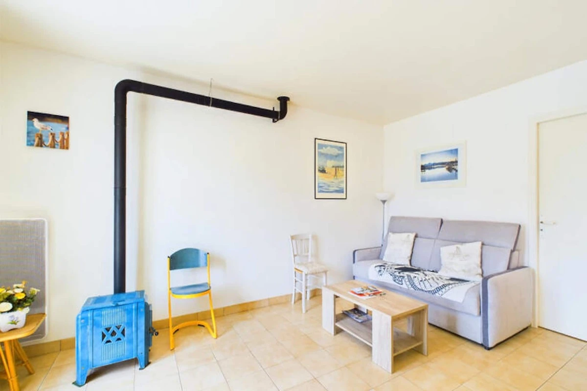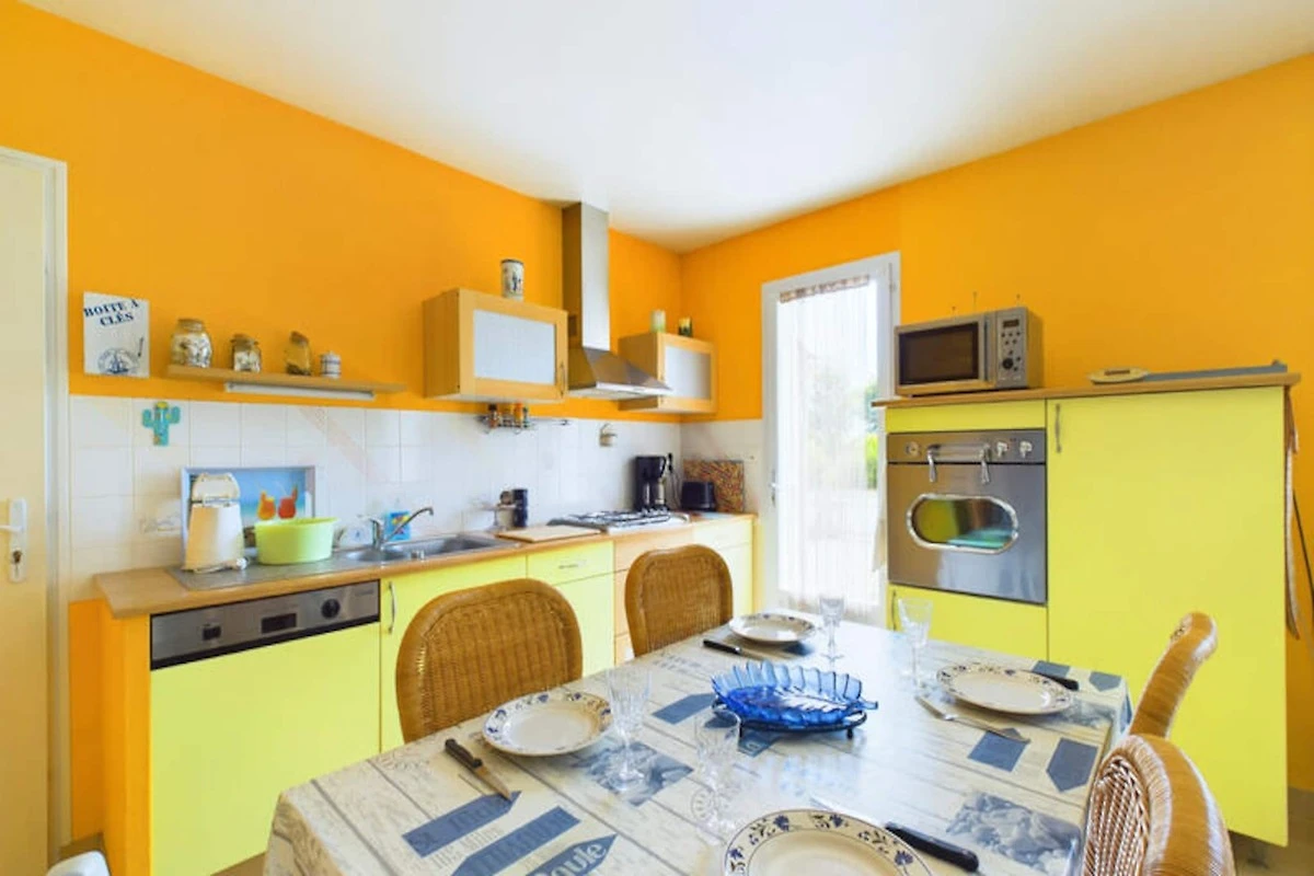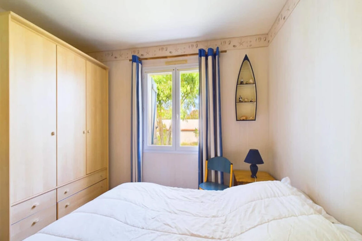 Im Herzen der Vendée verströmt dieses charmante Ferienhaus mit seinem traditionellen Ziegeldach, den blauen Fensterläden und dem privaten Garten voller farbenprächtiger Blumen einen ganz besonderen Charme. Ideal für Familien oder Paare, bietet dieses Haus Platz für bis zu sechs Gäste und ist ein ruhiger Rückzugsort nur wenige Minuten vom lebhaften Küstenort Saint-Gilles-Croix-de-Vie entfernt. Die maritim inspirierte Inneneinrichtung schafft eine gemütliche und einladende Atmosphäre mit zwei geschmackvoll eingerichteten Schlafzimmern und einem komfortablen Wohnzimmer. Die voll ausgestattete Küche, die nahtlos in den Wohnbereich übergeht, ermöglicht die einfache Zubereitung von Mahlzeiten, die Sie auf der Terrasse genießen können. Französische Türen führen in den Garten, wo Sie einen Grill, Sonnenliegen und einen ruhigen Ort zum Entspannen im Schatten alter Bäume finden. Eine Garage und eine Einfahrt bieten ausreichend Park- und Stauraum für Ihre Outdoor-Ausrüstung und sorgen so für Komfort während Ihres gesamten Aufenthalts. Kleine Haustiere sind willkommen, was dieses Ferienhaus zum perfekten Urlaub für die ganze Familie macht.