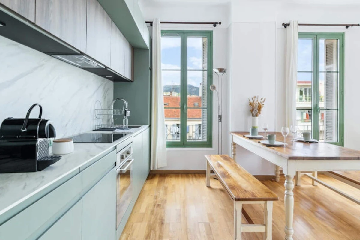 Im Herzen von Nizza, wo die pulsierende Energie der Côte d'Azur auf zeitlose Eleganz trifft, bietet die Cathedral Suite eine Oase der Ruhe über der belebten Avenue Jean Médecin. Im 5. Stock eines charmanten Gebäudes mit Aufzug gelegen, lädt dieses Apartment dazu ein, in den Rhythmus des Stadtlebens einzutauchen und gleichzeitig einen friedlichen Rückzugsort zu genießen. Von den Fenstern aus haben Sie einen atemberaubenden Blick auf die Stadt, während die mediterrane Sonne die Räume mit Wärme und Licht erfüllt. Nur 15 Gehminuten entfernt liegen die berühmten Strände von Nizza, und der nahegelegene Bahnhof bietet Ihnen eine bequeme Anbindung an die gesamte Riviera.