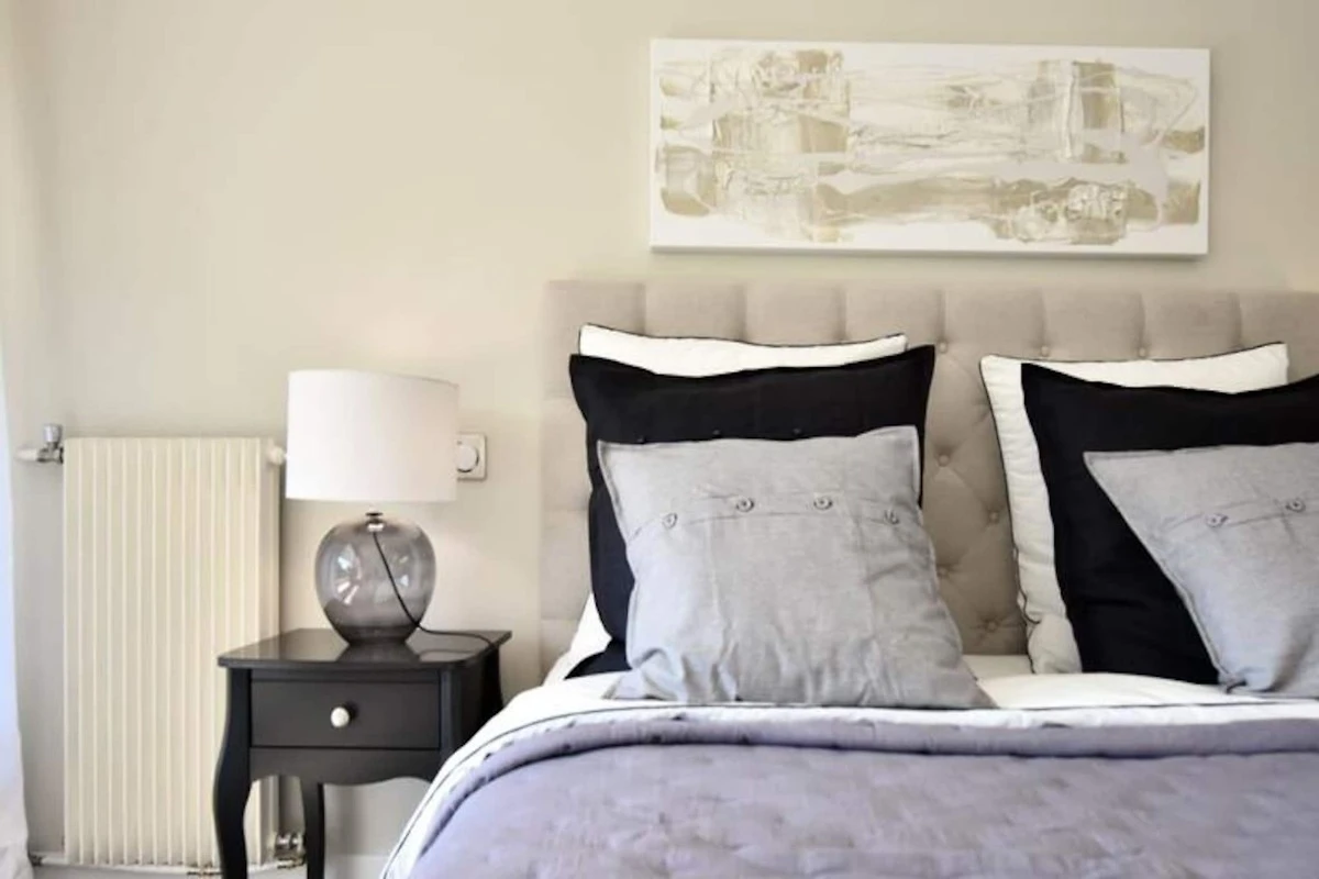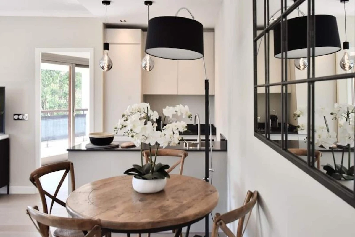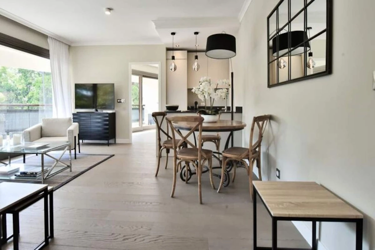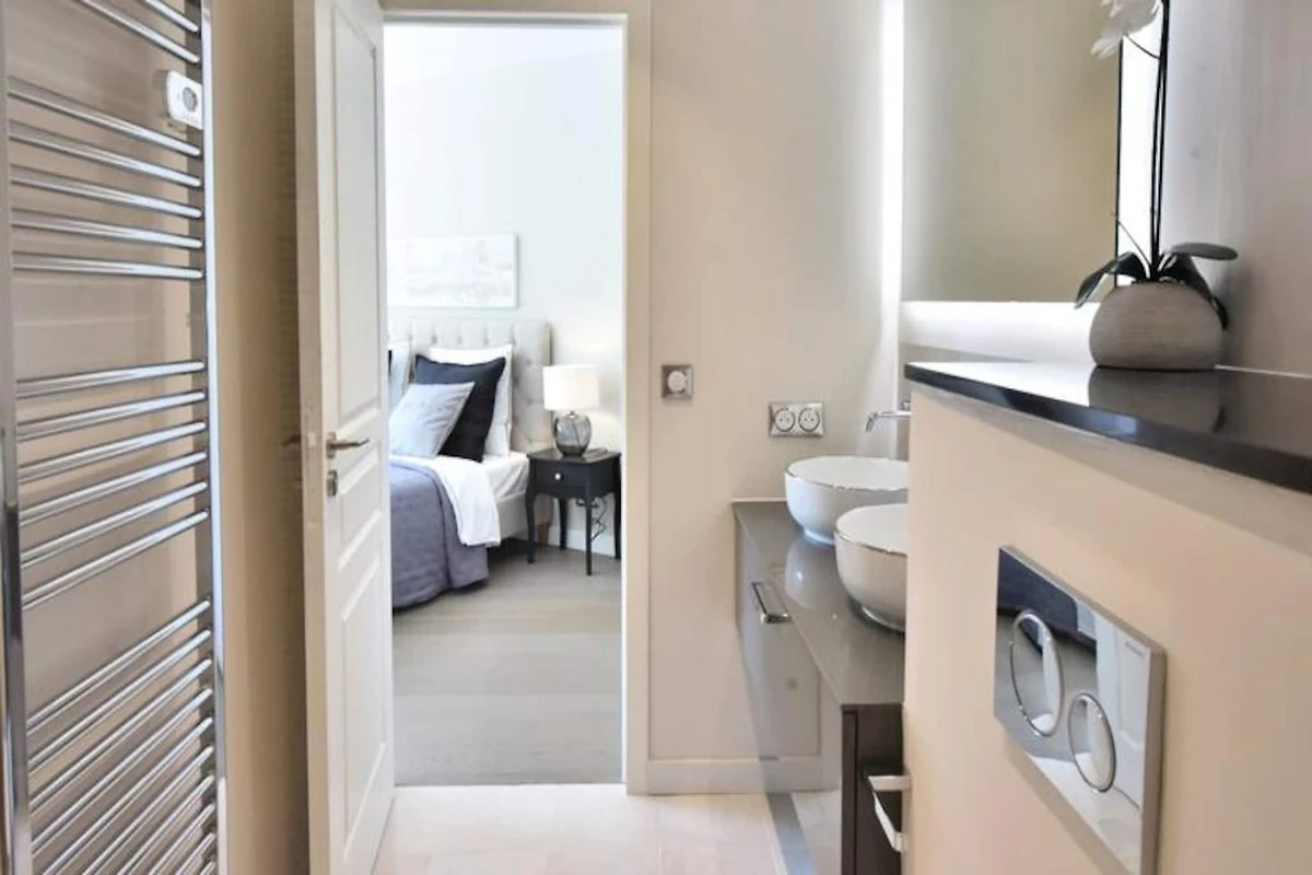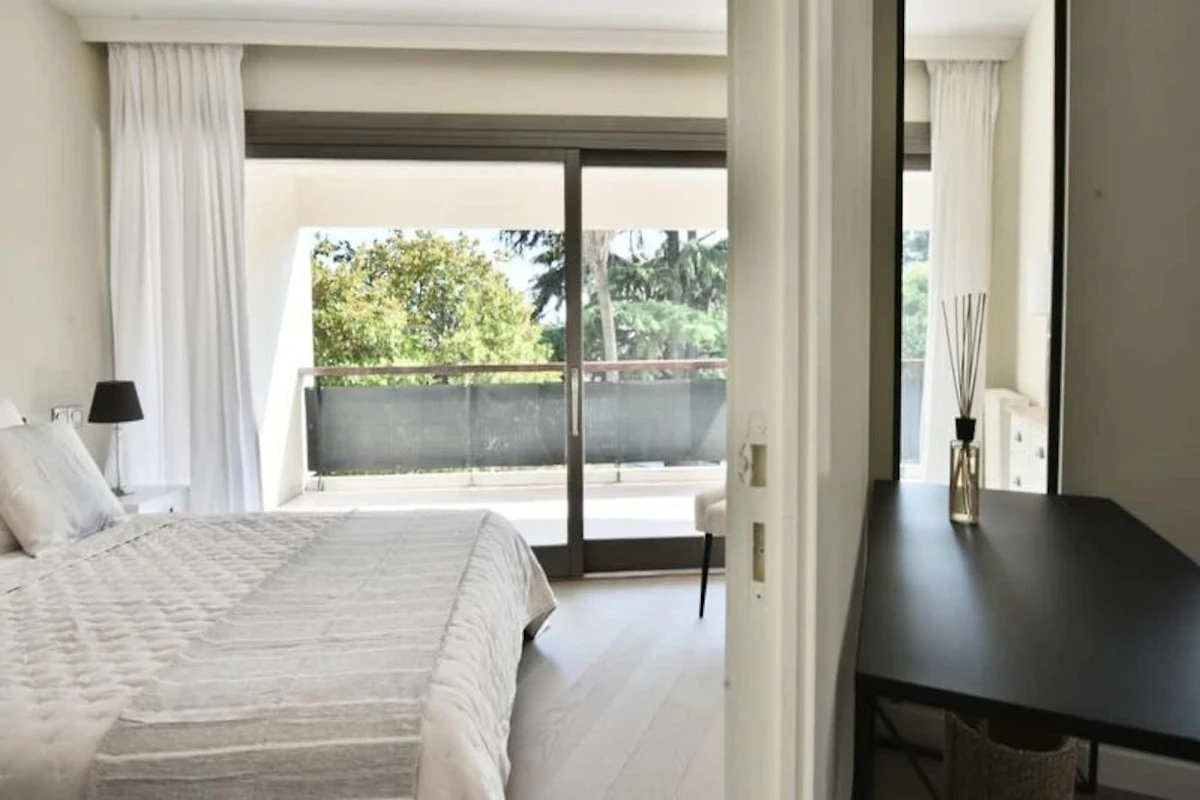 Tauchen Sie ein in eine Welt voller Eleganz und Komfort in diesem wunderschön renovierten Apartment im Herzen von Cannes. Entworfen von erfahrenen Innenarchitekten, bietet dieses helle und luftige Juwel die perfekte Mischung aus moderner Raffinesse und mediterranem Charme. Ob Sie geschäftlich oder privat reisen, die erstklassige Lage und die durchdachten Annehmlichkeiten versprechen einen unvergesslichen Aufenthalt. Stellen Sie sich vor, wie Sie morgens vom sanften Sonnenlicht geweckt werden, das durch die großen Fenster fällt, Ihr Frühstück auf der weitläufigen Terrasse genießen und nur wenige Minuten zur berühmten Croisette schlendern. Dies ist Ihr Tor zum Besten von Cannes. \n\nDas Apartment verfügt über zwei ruhige Schlafzimmer, jeweils mit einem Queensize-Bett und viel Stauraum. Das erste Schlafzimmer bietet ein eigenes Duschbad und direkten Zugang zur Terrasse – ideal, um sonnige Morgenstunden zu genießen. Das zweite Schlafzimmer bietet denselben Komfort, mit einem Duschbad in unmittelbarer Nähe. Der offene Wohnbereich ist ein echtes Highlight: eine gemütliche Lounge mit Smart-TV, ein Essbereich für vier Personen und eine voll ausgestattete Küche mit Backofen und Geschirrspüler. Highspeed-WLAN und eine Klimaanlage mit Heiz- und Kühlfunktion sorgen ganzjährig für angenehmen Komfort. \n\nEntdecken Sie das lebhafte Viertel Montfleury mit seinen charmanten Geschäften wie Bäckereien, Weinhandlungen und Blumenläden, die eine einladende, dörfliche Atmosphäre schaffen. Die Rue d’Antibes, das Stadtzentrum, erreichen Sie in nur 5 Gehminuten, die glamouröse Croisette mit ihren Stränden in 10 Minuten. Für Reisende mit Bahn oder Flugzeug ist die Unterkunft ideal gelegen, in der Nähe des Bahnhofs Cannes und des Flughafens Nizza Côte d’Azur. \n\nMit seiner sicheren Anlage, dem großen Gemeinschaftsparkplatz und dem Concierge-Service ist dieses Apartment die ideale Wahl für einen unkomplizierten und luxuriösen Aufenthalt in Cannes. Ob Filmfestival, romantischer Kurzurlaub oder erholsamer Urlaub – diese Unterkunft ist der perfekte Rückzugsort.