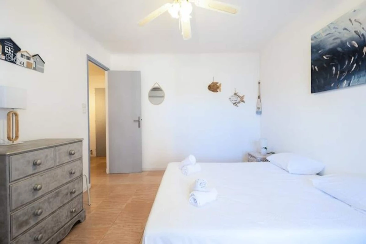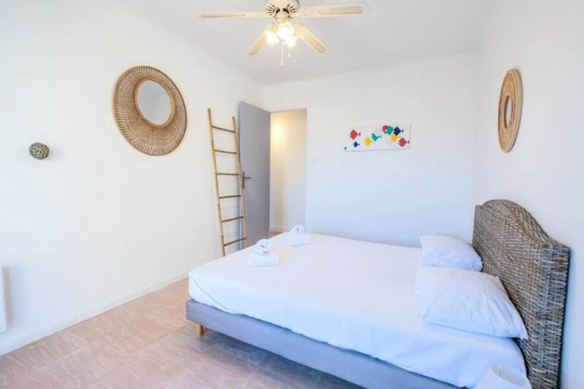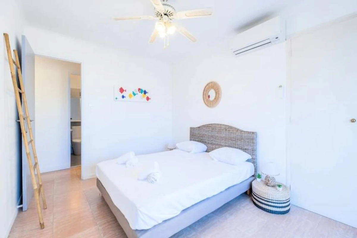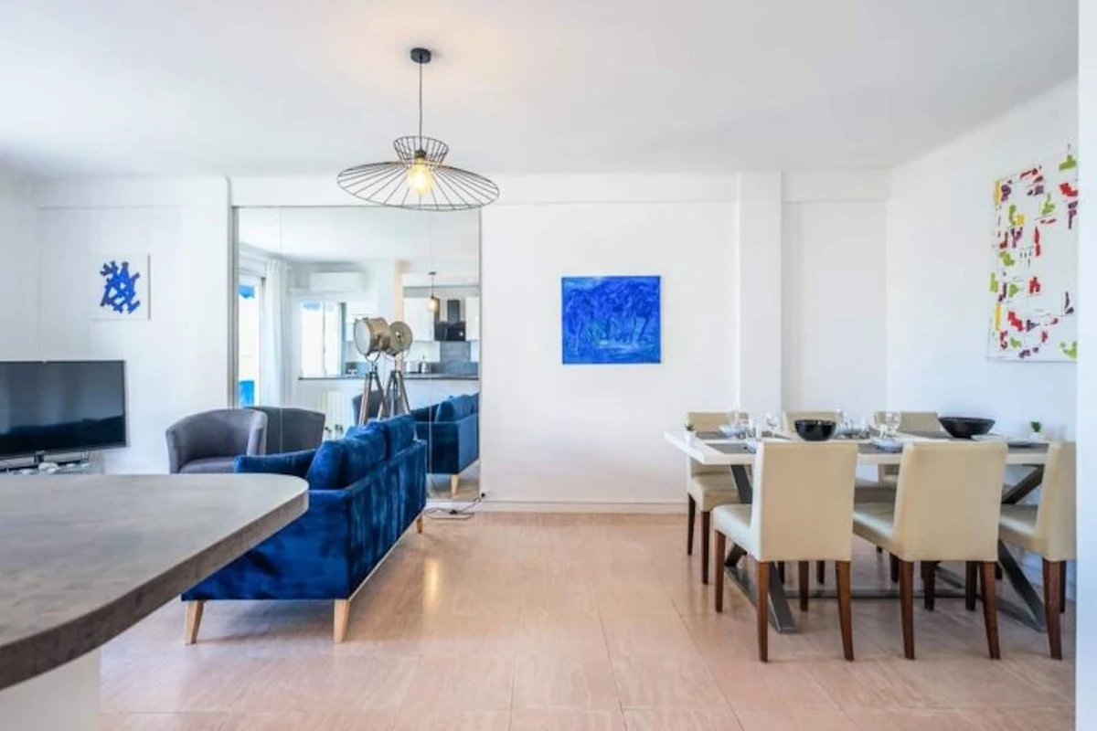 Eine sanfte Brise trägt den Duft des Mittelmeers herüber, wenn Sie die Terrasse dieses eleganten, 85 m² großen Apartments betreten, das sich in perfekter Lage im Herzen von Palm Beach, Cannes, befindet. Nur zwei Gehminuten vom Sandstrand Mouré Rouge entfernt, lädt Sie diese Unterkunft ein, den typischen Lebensstil der Côte d’Azur zu genießen. Ob Sie Ihren Morgenkaffee mit Blick aufs Meer schlürfen oder einen entspannten Spaziergang entlang der berühmten Croisette unternehmen – jeder Moment hier ist ein Fest des Küstencharmes. \n\nIm Inneren bietet das Apartment eine harmonische Verbindung von Komfort und Stil. Das geräumige Wohnzimmer öffnet sich zur nach Osten ausgerichteten Terrasse, ideal für ein sonniges Frühstück oder ruhige Nachmittage. Eine voll ausgestattete offene Küche ermöglicht die mühelose Zubereitung von Mahlzeiten, während zwei ruhige Schlafzimmer – jeweils mit Queensize-Betten, viel Stauraum und privatem Zugang ins Freie – erholsame Rückzugsorte bieten. Moderne Annehmlichkeiten wie Klimaanlage, WLAN und doppelt verglaste Fenster sorgen für einen ruhigen und komfortablen Aufenthalt. Das sichere Gebäude mit Fernzugriff und privatem Parkplatz für einen Kleinwagen bietet zusätzlichen Komfort für Ihren Urlaub. \n\nEntdecken Sie das lebhafte Viertel Palm Beach mit seinen charmanten Geschäften, Bäckereien und Restaurants in unmittelbarer Nähe. Spazieren Sie zum Strand Mouré Rouge für ein erfrischendes Bad oder entspannen Sie bei einem Cocktail auf einer Terrasse am Meer. Die berühmte Croisette mit ihrem Karussell und den Bootsrennen erreichen Sie in nur fünf Minuten zu Fuß, während die historischen Straßen von Le Suquet und der Panoramablick von Notre-Dame d’Espérance bequem mit dem Auto erreichbar sind. \n\nOb Sie sonnige Tage am Meer, kulinarische Genüsse oder kulturelle Entdeckungen suchen – dieses Apartment ist der perfekte Ausgangspunkt für einen unvergesslichen Urlaub an der Riviera. Lassen Sie sich vom Zauber von Cannes verzaubern und schaffen Sie Erinnerungen, die Sie für immer in Ihrem Herzen bewahren werden.