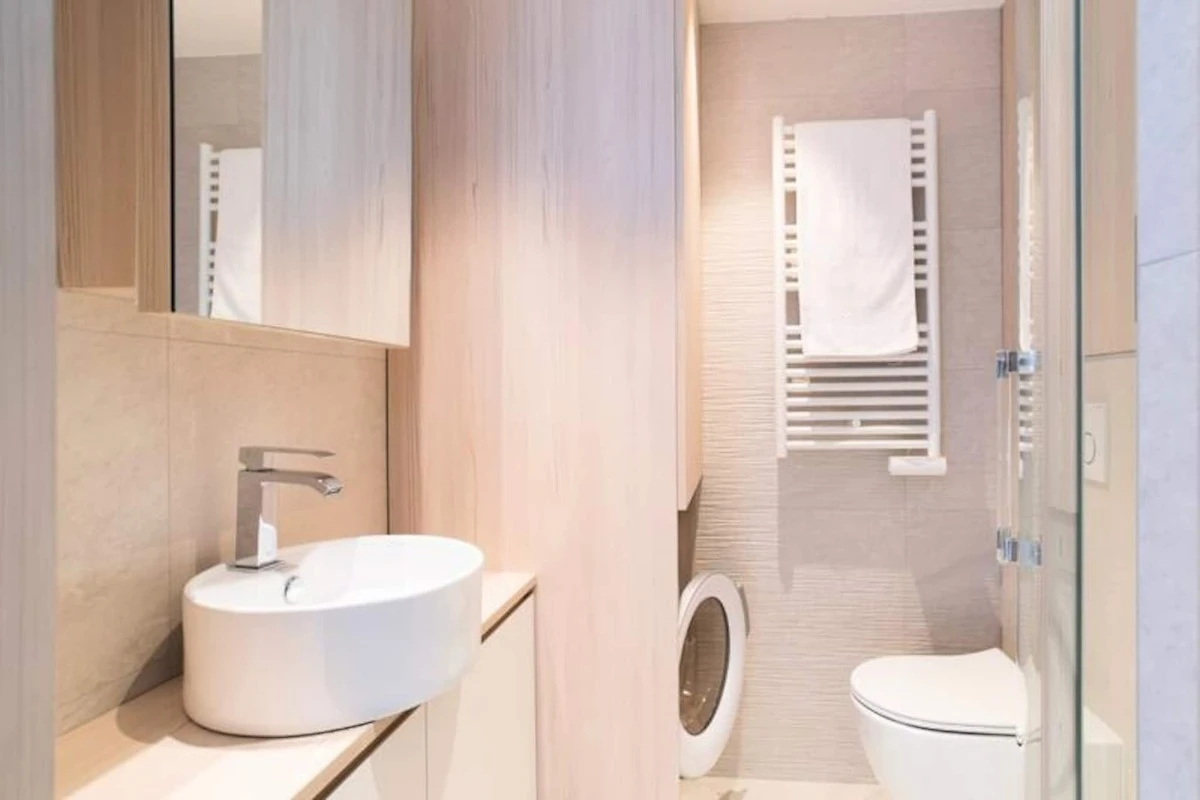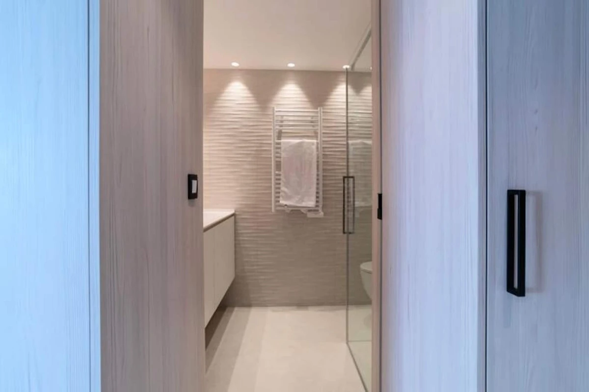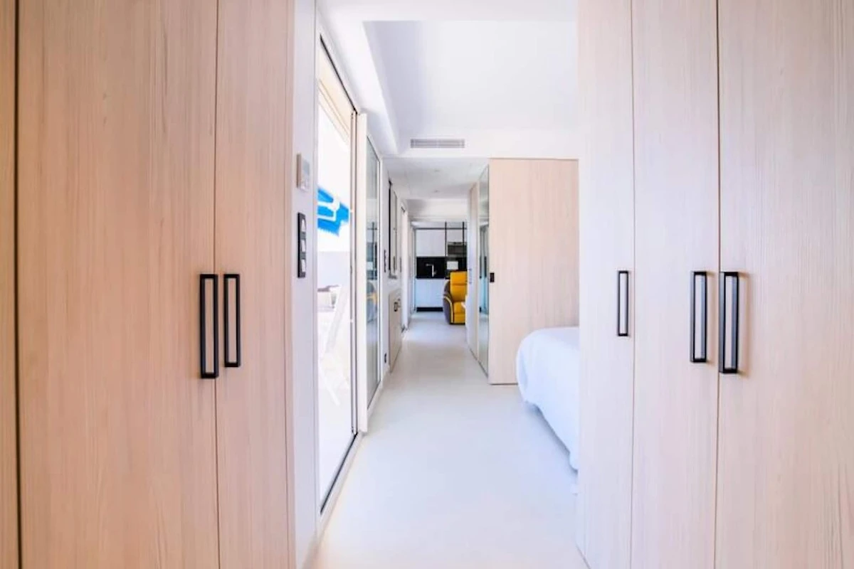 Das Apartment verfügt über einen geräumigen, lichtdurchfluteten Wohnbereich mit einem bequemen Schlafsofa, einem Smart-TV und einer voll ausgestatteten Küche, die durch eine elegante Glaswand abgetrennt ist. Die Master-Suite ist eine Oase der Entspannung mit einem luxuriösen Queensize-Bett, einem begehbaren Kleiderschrank, einem eigenen Duschbad und einem Smart-TV. Ein zweites Duschbad sorgt für Komfort für alle Gäste. Im Außenbereich erwartet Sie ein 75 m² großer, privater Garten mit einem Esstisch für acht Personen, Sonnenliegen und direktem Zugang zum nur zwei Minuten entfernten Strand.