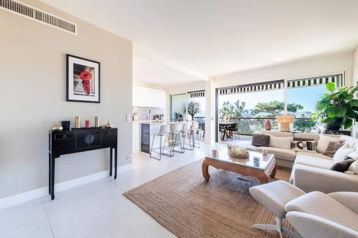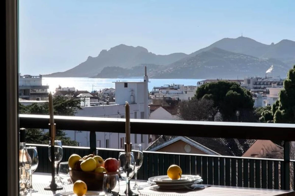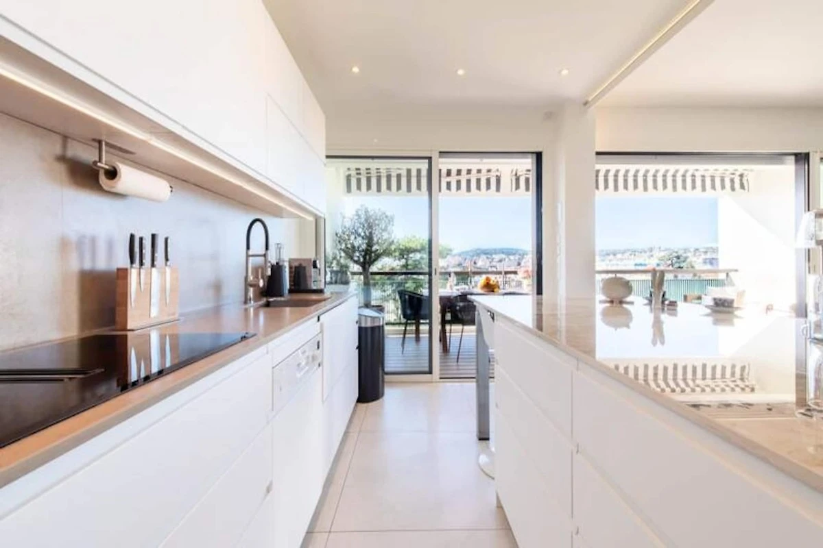 Hoch über der glitzernden Küste von Cannes bietet dieses elegante 95 m² große Apartment in der prestigeträchtigen Gallia Residence einen exklusiven Rückzugsort für Urlauber und Geschäftsreisende. Stellen Sie sich vor, Sie betreten die weitläufige Terrasse und genießen den atemberaubenden, endlosen Meerblick, der Sie einlädt, den mediterranen Charme zu erleben. Mit seinem modernen Design und der ruhigen Atmosphäre verspricht dieses Apartment einen unvergesslichen Aufenthalt in einem der glamourösesten Reiseziele Frankreichs. \n\nIm Inneren erwartet Sie ein Meisterwerk an Komfort und Stil. Das geräumige, lichtdurchflutete Wohnzimmer ist mit bequemen Sofas, einem Smart-TV und einem einladenden Essbereich ausgestattet, die alle nahtlos in die Terrasse übergehen. Die offene Küche ist mit hochwertigen Geräten ausgestattet und eignet sich perfekt, um Mahlzeiten in geselliger Atmosphäre zuzubereiten. Die Schlafräume umfassen ein luxuriöses Hauptschlafzimmer mit Queensize-Bett, eigenem Duschbad und Zugang zur privaten Terrasse sowie ein zweites Schlafzimmer mit zwei Einzelbetten und eigenem Bad. Klimaanlage und WLAN sorgen ganzjährig für Komfort und Bequemlichkeit. In einer ruhigen Wohngegend gelegen, ist dieses Apartment nur wenige Gehminuten von den berühmten Sehenswürdigkeiten von Cannes entfernt. Schlendern Sie zu den Stränden und der bekannten Croisette, erkunden Sie die lebhafte Rue d'Antibes mit ihren zahlreichen Geschäften oder tauchen Sie ein in den historischen Charme von Le Suquet. Der Alte Hafen und der Markt von Forville sind bequem zu erreichen und bieten Ihnen einen Einblick in das authentische provenzalische Leben. Für ein unvergessliches Erlebnis unternehmen Sie einen Bootsausflug zu den Lérins-Inseln und entdecken Sie deren idyllische Schönheit. Ob Sie sich erholen oder geschäftlich unterwegs sind – dieses Apartment vereint Luxus, erstklassige Lage und Komfort und ist somit die perfekte Wahl für Ihren Aufenthalt in Cannes.