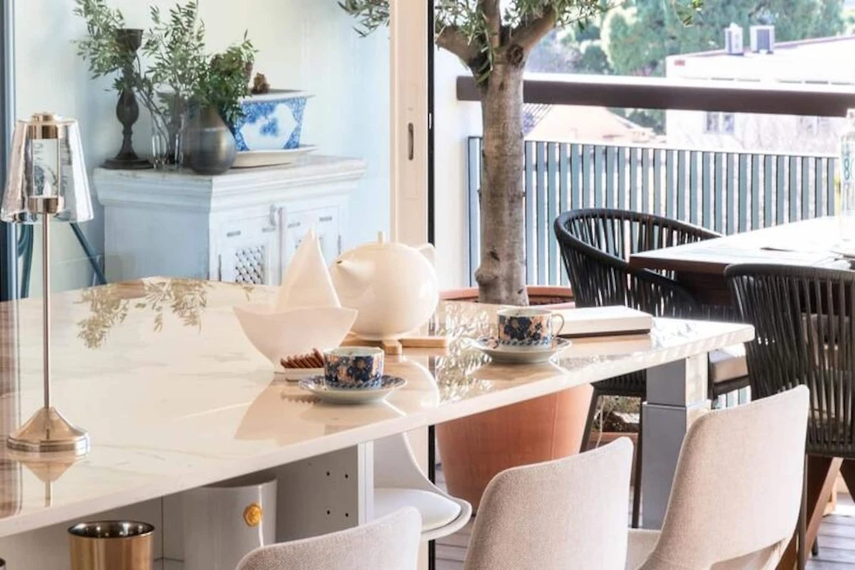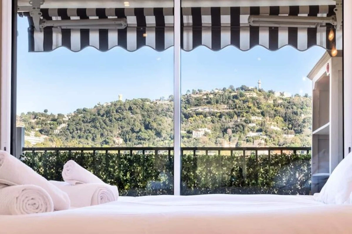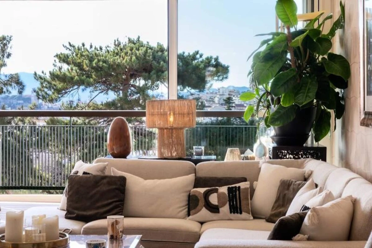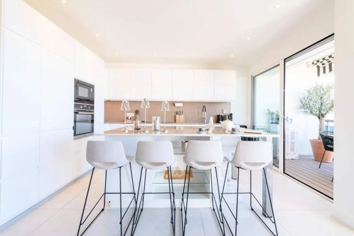 Hoch über der glitzernden Küste von Cannes bietet dieses elegante 95 m² große Apartment in der prestigeträchtigen Gallia Residence einen exklusiven Rückzugsort für Urlauber und Geschäftsreisende. Stellen Sie sich vor, Sie betreten die weitläufige Terrasse und genießen den atemberaubenden, endlosen Meerblick, der Sie einlädt, den mediterranen Charme zu erleben. Mit seinem modernen Design und der ruhigen Atmosphäre verspricht dieses Apartment einen unvergesslichen Aufenthalt in einem der glamourösesten Reiseziele Frankreichs. \n\nIm Inneren erwartet Sie ein Meisterwerk an Komfort und Stil. Das geräumige, lichtdurchflutete Wohnzimmer ist mit bequemen Sofas, einem Smart-TV und einem einladenden Essbereich ausgestattet, die alle nahtlos in die Terrasse übergehen. Die offene Küche ist mit hochwertigen Geräten ausgestattet und eignet sich perfekt, um Mahlzeiten in geselliger Atmosphäre zuzubereiten. Die Schlafräume umfassen ein luxuriöses Hauptschlafzimmer mit Queensize-Bett, eigenem Duschbad und Zugang zur privaten Terrasse sowie ein zweites Schlafzimmer mit zwei Einzelbetten und eigenem Bad. Klimaanlage und WLAN sorgen ganzjährig für Komfort und Bequemlichkeit. In einer ruhigen Wohngegend gelegen, ist dieses Apartment nur wenige Gehminuten von den berühmten Sehenswürdigkeiten von Cannes entfernt. Schlendern Sie zu den Stränden und der bekannten Croisette, erkunden Sie die lebhafte Rue d'Antibes mit ihren zahlreichen Geschäften oder tauchen Sie ein in den historischen Charme von Le Suquet. Der Alte Hafen und der Markt von Forville sind bequem zu erreichen und bieten Ihnen einen Einblick in das authentische provenzalische Leben. Für ein unvergessliches Erlebnis unternehmen Sie einen Bootsausflug zu den Lérins-Inseln und entdecken Sie deren idyllische Schönheit. Ob Sie sich erholen oder geschäftlich unterwegs sind – dieses Apartment vereint Luxus, erstklassige Lage und Komfort und ist somit die perfekte Wahl für Ihren Aufenthalt in Cannes.