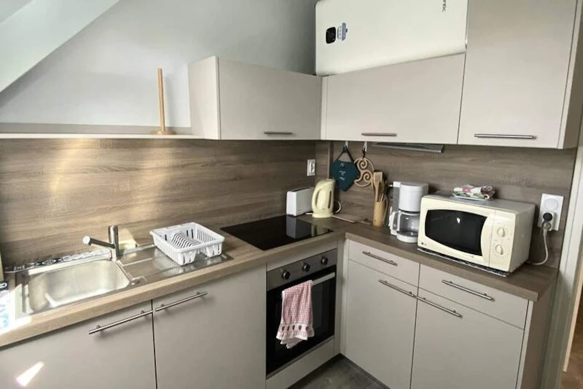 Das 32 Quadratmeter große Apartment ist durchdacht gestaltet und bietet maximalen Komfort und Funktionalität. Das Wohn-/Esszimmer verfügt über ein Schlafsofa, ein Einzelbett, einen kleinen Essbereich und einen Fernseher und bietet so einen einladenden Ort zum Entspannen nach einem erlebnisreichen Tag. Die voll ausgestattete Küche bietet moderne Geräte wie Backofen, Induktionskochfeld, Kühlschrank, Kaffeemaschine, Wasserkocher, Toaster und Mikrowelle – alles, was Sie für die Zubereitung köstlicher Mahlzeiten benötigen. Das Schlafzimmer ist mit einem gemütlichen Doppelbett ausgestattet, und das Badezimmer verfügt über ein WC für zusätzlichen Komfort. Bitte beachten Sie, dass Haustiere nicht erlaubt sind und die Wohnung über steile Treppen verfügt, die möglicherweise nicht für jeden geeignet sind. Optionale Extras wie Reinigungsservice, Bettwäscheverleih und ein Babybett stehen zur Verfügung, um Ihren Aufenthalt noch angenehmer zu gestalten.