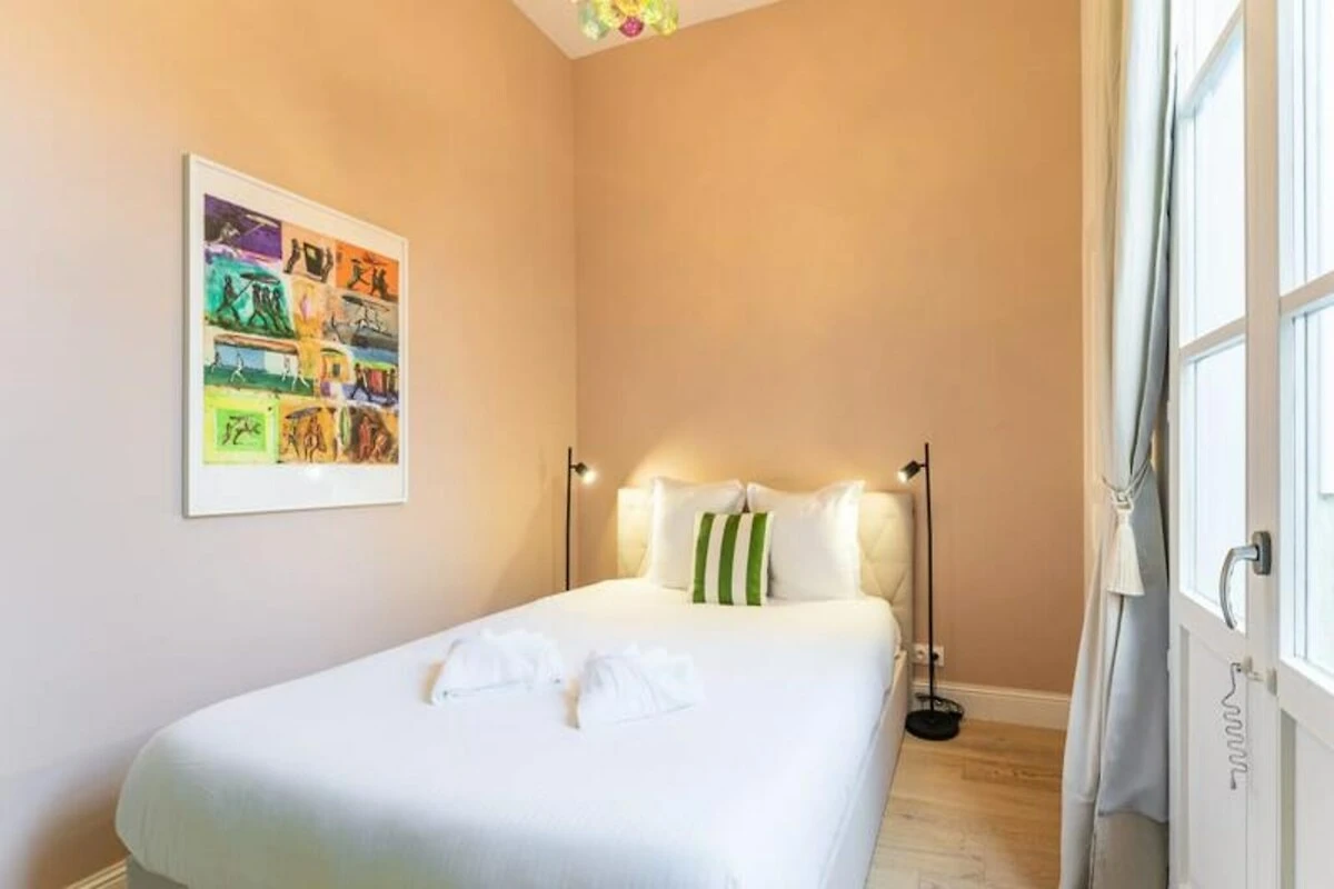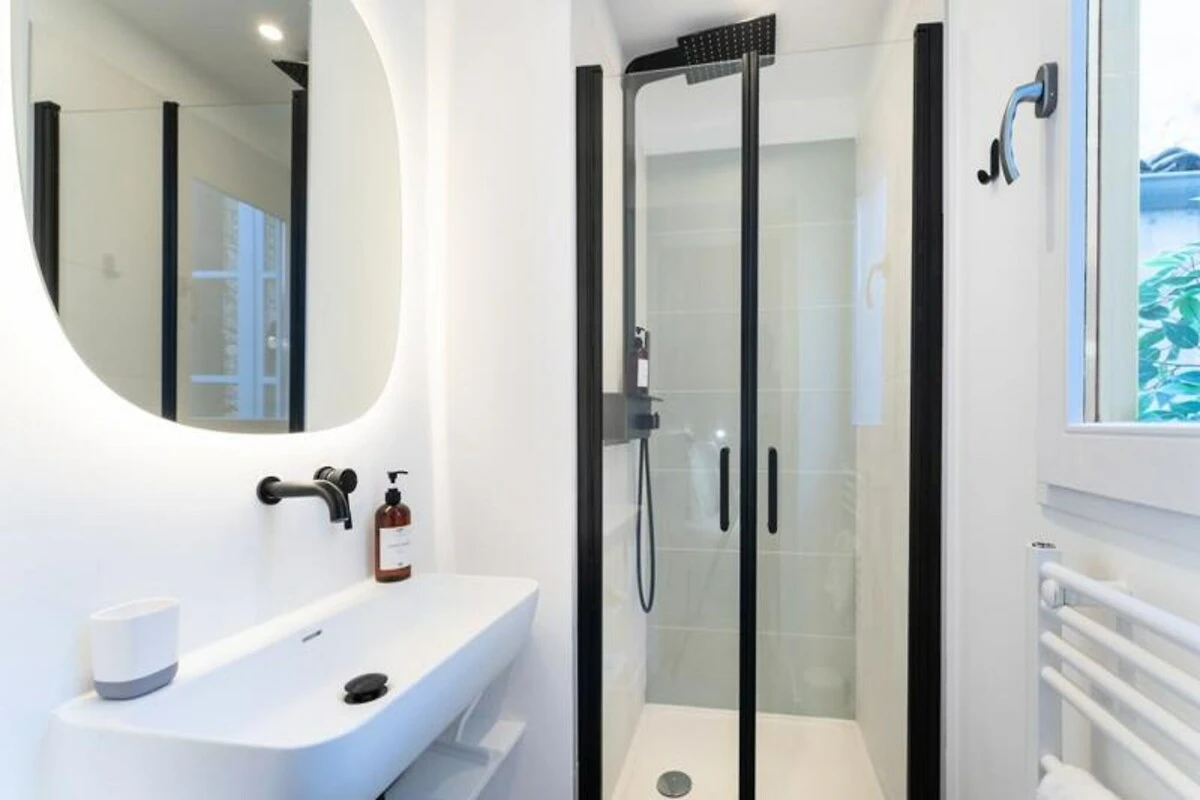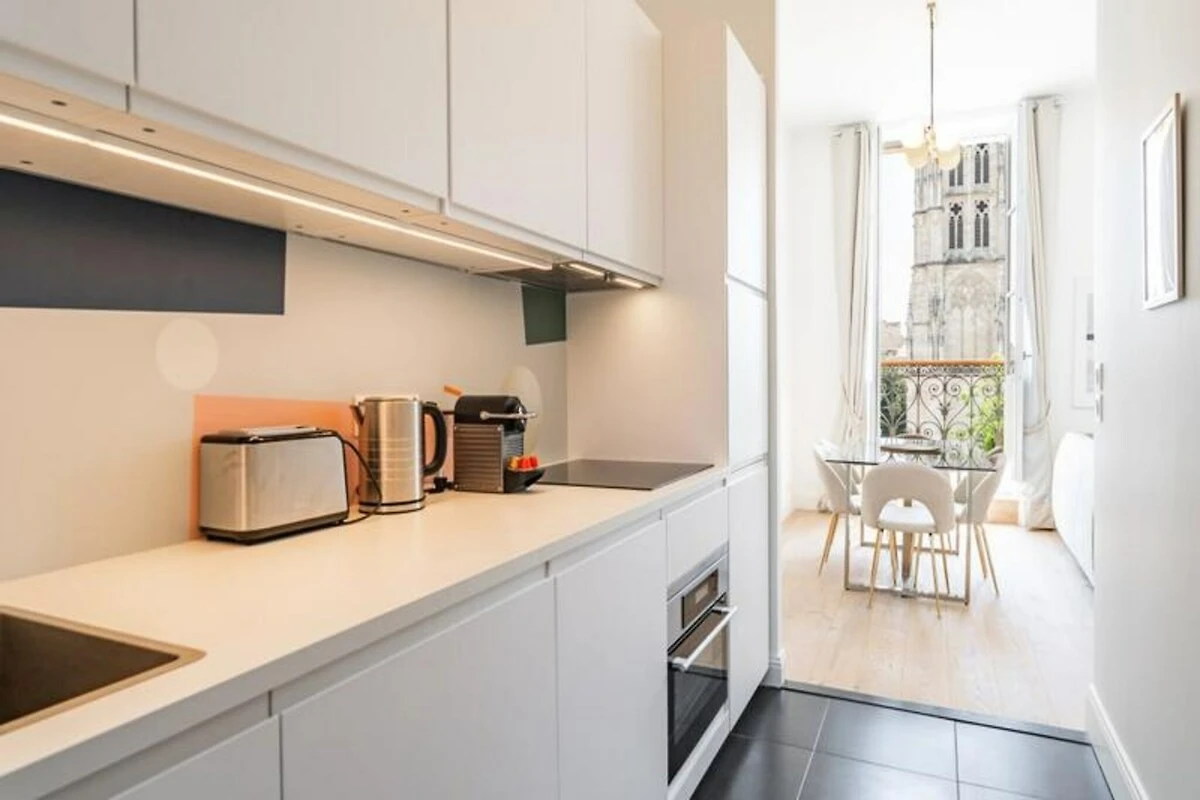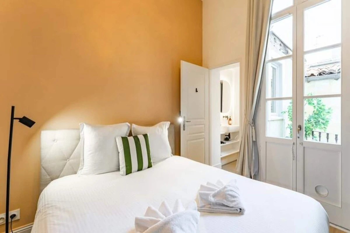 Dieses Apartment im dritten Stock vereint auf harmonische Weise den Charme vergangener Zeiten mit modernem Luxus. Das helle Wohnzimmer mit geschmackvoller Einrichtung verfügt über ein bequemes Schlafsofa und einen Flachbildfernseher und lädt zum Entspannen nach einem erlebnisreichen Tag in der Stadt ein. Die voll ausgestattete offene Küche bietet Ihnen die Möglichkeit, Mahlzeiten zuzubereiten und dabei die gesellige Atmosphäre zu genießen. Das ruhige Schlafzimmer mit eigenem Bad und großer Dusche sorgt für erholsame Nächte, während die Klimaanlage ganzjährig für angenehme Temperaturen sorgt. Ein seltenes Juwel in Bordeaux: Ein privater Parkplatz ist inklusive und bietet Ihnen so unübertroffenen Komfort im pulsierenden Stadtzentrum.
