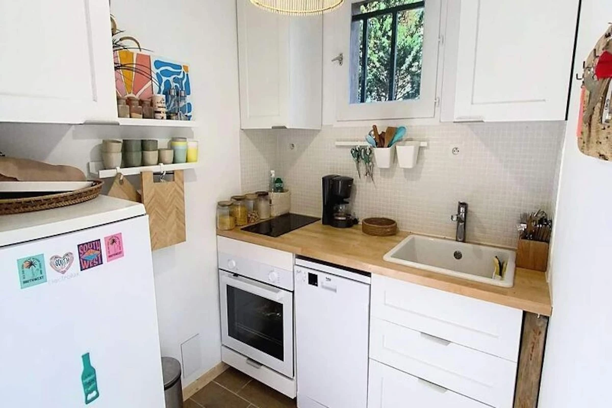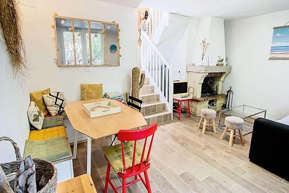 Inmitten der idyllischen Landschaft Südwestfrankreichs bietet dieses charmante Doppelhaus einen traumhaften Rückzugsort für bis zu sechs Gäste. Mit seinen wunderschön renovierten Innenräumen und der mehrgeschossigen Raumaufteilung lädt das Haus dazu ein, Komfort und Charakter gleichermaßen zu erleben. Ob Sie eine ruhige Auszeit oder einen aktiven Urlaub suchen – dieses Haus bietet die perfekte Balance zwischen Entspannung und Abenteuer. Stellen Sie sich vor, wie Sie entspannte Morgenstunden auf der schattigen Terrasse genießen, umgeben vom sanften Rauschen der Bäume und dem Duft der frischen Landluft. Die Atmosphäre hier ist geprägt von Ruhe und zeitlosem Charme. \n\nIm Inneren ist das Haus durchdacht gestaltet und lässt keine Wünsche offen. Der Eingang führt in eine voll ausgestattete, separate Küche, ideal für die Zubereitung köstlicher Mahlzeiten mit regionalen Zutaten. Der darunterliegende Wohn- und Essbereich öffnet sich zur Terrasse und schafft so einen fließenden Übergang zwischen Innen und Außen – perfekt für gesellige Runden oder ruhige Abende. Die Schlafgelegenheiten verteilen sich auf zwei Ebenen und umfassen drei gemütliche Schlafzimmer: eines mit einem 160 cm breiten Doppelbett, ein weiteres mit drei Einzelbetten (darunter ein Etagenbett) und ein drittes mit einem 140 cm breiten Doppelbett. Ein modernes Duschbad und ein separates WC sorgen für Komfort, während das teilweise umzäunte Grundstück mit Gartenmöbeln und Grill zum einladenden Ambiente des Hauses beiträgt. Ein Gartenhaus steht den Gästen ebenfalls zur Verfügung, und Parkplätze befinden sich in unmittelbarer Nähe. \n\nDie Lage des Anwesens ist ideal, um die Highlights der Region zu entdecken. Strand und Geschäfte des täglichen Bedarfs sind nur 1,5 km entfernt und bieten bequemen Zugang zu sonnigen Küsten und charmanten Boutiquen. Golfliebhaber werden den nahegelegenen Golfplatz (nur 2 km entfernt) zu schätzen wissen, und der ruhige See, perfekt für Picknicks und Wassersport, ist nur 5 km von der Haustür entfernt. Ob Sie durch die malerische Umgebung spazieren oder sich Outdoor-Abenteuern hingeben – dieses Haus liegt mittendrin. \n\nMit seiner Mischung aus modernem Komfort und rustikalem Charme ist dieses Anwesen eine ausgezeichnete Wahl für Familien oder Freundesgruppen, die unvergessliche Erinnerungen in der französischen Landschaft schaffen möchten. Lassen Sie sich von der Schönheit der Region und der Gemütlichkeit dieses Hauses zu Ihrem nächsten Urlaub inspirieren.