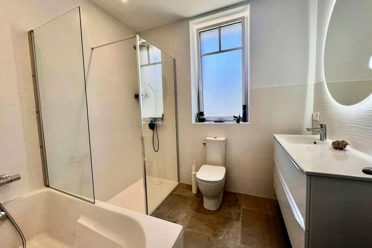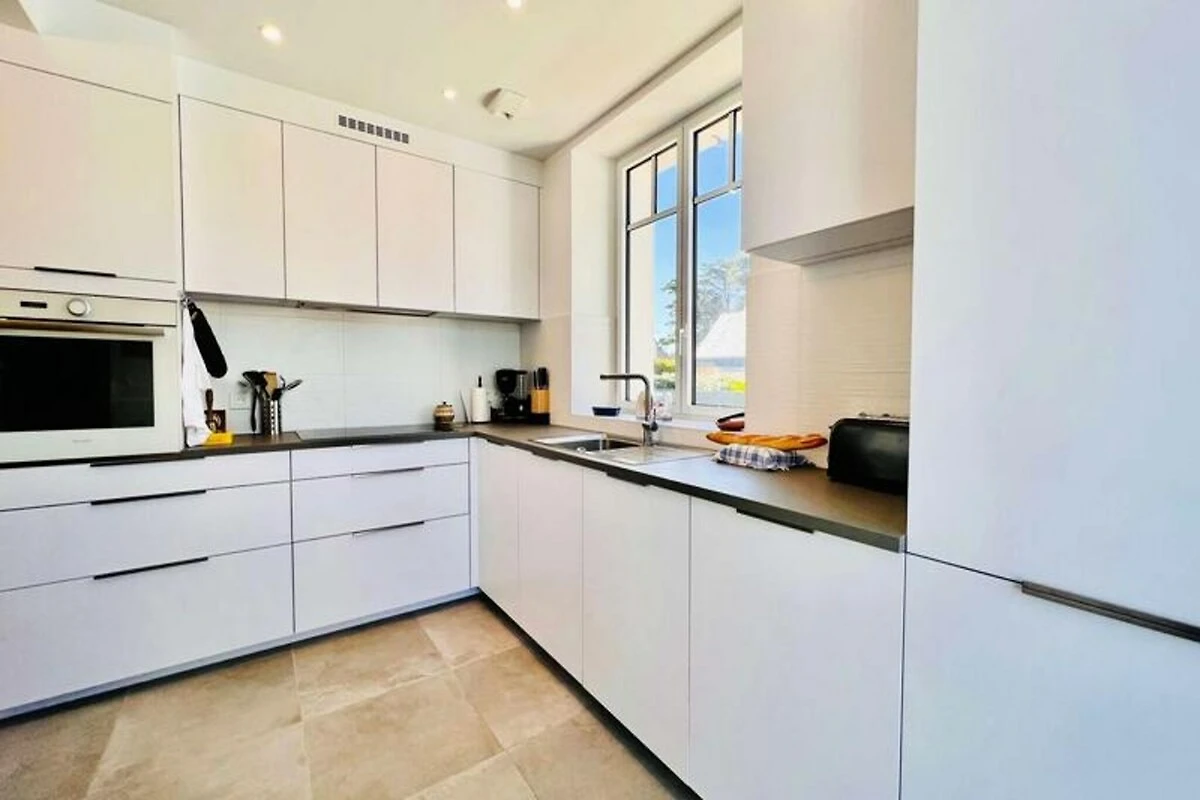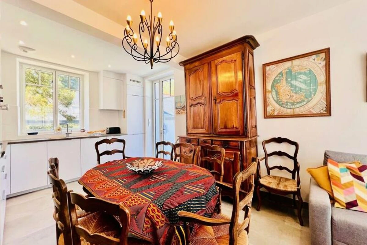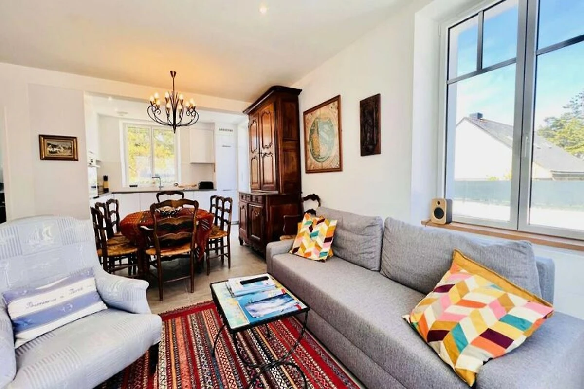 In dem charmanten Küstenort Saint-Pierre-Quiberon lädt dieses wunderschön renovierte Haus Sie ein, die perfekte Kombination aus Komfort und Strandleben zu erleben. Nur 650 Meter von den ruhigen Stränden der Bucht entfernt, bietet dieses geräumige Anwesen mit 195 m² Wohnfläche Platz für bis zu 14 Gäste und ist ideal für unvergessliche Familienurlaube. Ob Sie Entspannung oder Abenteuer suchen – dieses Haus bietet den perfekten Rahmen für unvergessliche Erinnerungen. \n\nTreten Sie ein und entdecken Sie ein warmes und einladendes Erdgeschoss mit einem Wohn- und Essbereich mit gemütlichen Sitzgelegenheiten, einem Fernseher und einem Esstisch. Die offene Küche ist mit modernen Geräten wie Backofen, Geschirrspüler, Kühlschrank und Induktionskochfeld ausgestattet und ermöglicht Ihnen die einfache Zubereitung köstlicher Mahlzeiten. Ein Hauswirtschaftsraum, ein komfortables Doppelzimmer und ein Badezimmer mit Dusche und Badewanne vervollständigen das Erdgeschoss. Im Obergeschoss befinden sich vier weitere Schlafzimmer mit Doppel- und Einzelbetten sowie ein Badezimmer. Ein Nebengebäude bietet zusätzlichen Charme und Funktionalität mit separatem Wohnbereich, eigener Küche, Wohnzimmer und zwei Schlafzimmern. Ideal für Familien oder Freundesgruppen. Draußen lädt ein großer, nach Süden ausgerichteter Garten mit Terrasse zum Entspannen im Freien oder einfach zum Sonnenbaden ein. Parkplätze für bis zu drei Fahrzeuge gewährleisten problemloses Parken während Ihres gesamten Aufenthalts. Die Strände der Bucht sind nur wenige Gehminuten entfernt und die malerische Umgebung von Saint-Pierre-Quiberon liegt direkt vor der Tür – dieses Anwesen ist der ideale Ausgangspunkt, um die Schönheit der Bretagne zu entdecken. Ob Wassersport, Küstenwanderungen oder einfach nur Entspannung im Garten – dieses Haus verspricht einen erholsamen und unvergesslichen Urlaub.