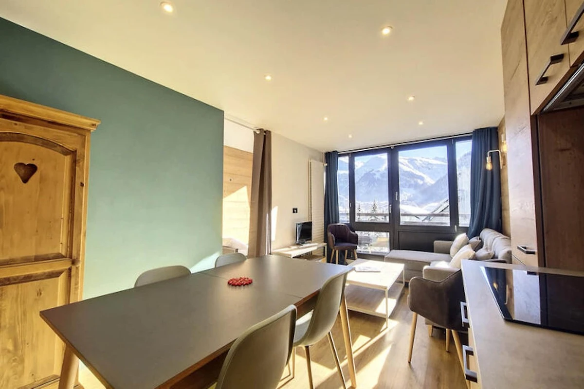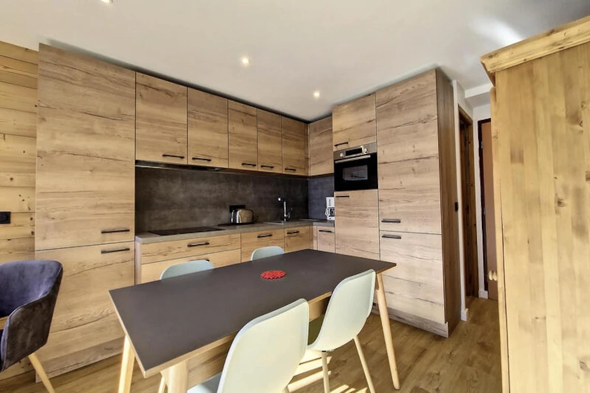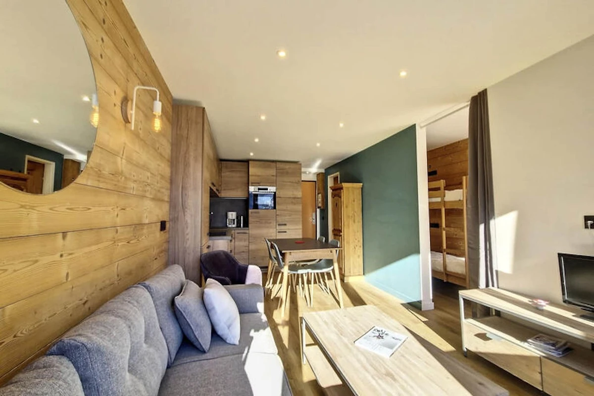 Dieses gemütliche 31 m² große Studio ist durchdacht gestaltet und bietet maximalen Komfort und Funktionalität. Der Wohnbereich verfügt über ein Schlafsofa, einen Essbereich und eine Sitzecke mit Fernseher und schafft so eine warme und einladende Atmosphäre zum Entspannen nach einem Tag auf der Piste. Die Schlafnische bietet ein Etagenbett und ein Einzelbett – ideal für Familien oder kleine Gruppen. Die voll ausgestattete Küche umfasst ein Cerankochfeld, einen Backofen, eine Mikrowelle und einen Geschirrspüler, sodass Sie alles haben, um leckere Mahlzeiten zuzubereiten. Ein separates Badezimmer mit WC und eine Waschmaschine sorgen für zusätzlichen Komfort während Ihres Aufenthalts.