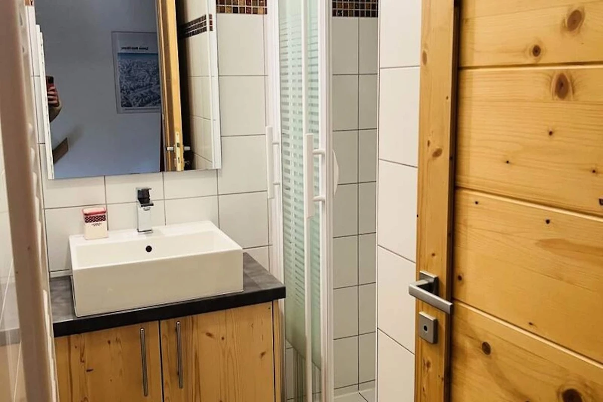 Das Triplex ist durchdacht gestaltet und bietet auf drei Ebenen Platz für bis zu sechs Gäste. Im Erdgeschoss befinden sich zwei gemütliche Schlafzimmer, eines mit einem Doppelbett und das andere mit zwei Einzelbetten, die zusammengestellt werden können. Die offene Galerie im ersten Obergeschoss bietet mit zwei Einzelbetten zusätzlichen Schlafplatz – perfekt für Kinder oder Freunde. Der helle und einladende Wohnbereich im Erdgeschoss verfügt über eine moderne Küchenzeile mit Backofen, Mikrowelle, Induktionskochfeld und Geschirrspüler. Eine nach Süden ausgerichtete Terrasse mit Gartenmöbeln und Sonnenschirm lädt zum Entspannen und Genießen des Alpenpanoramas ein.