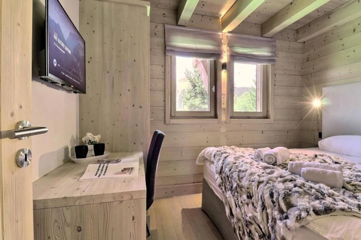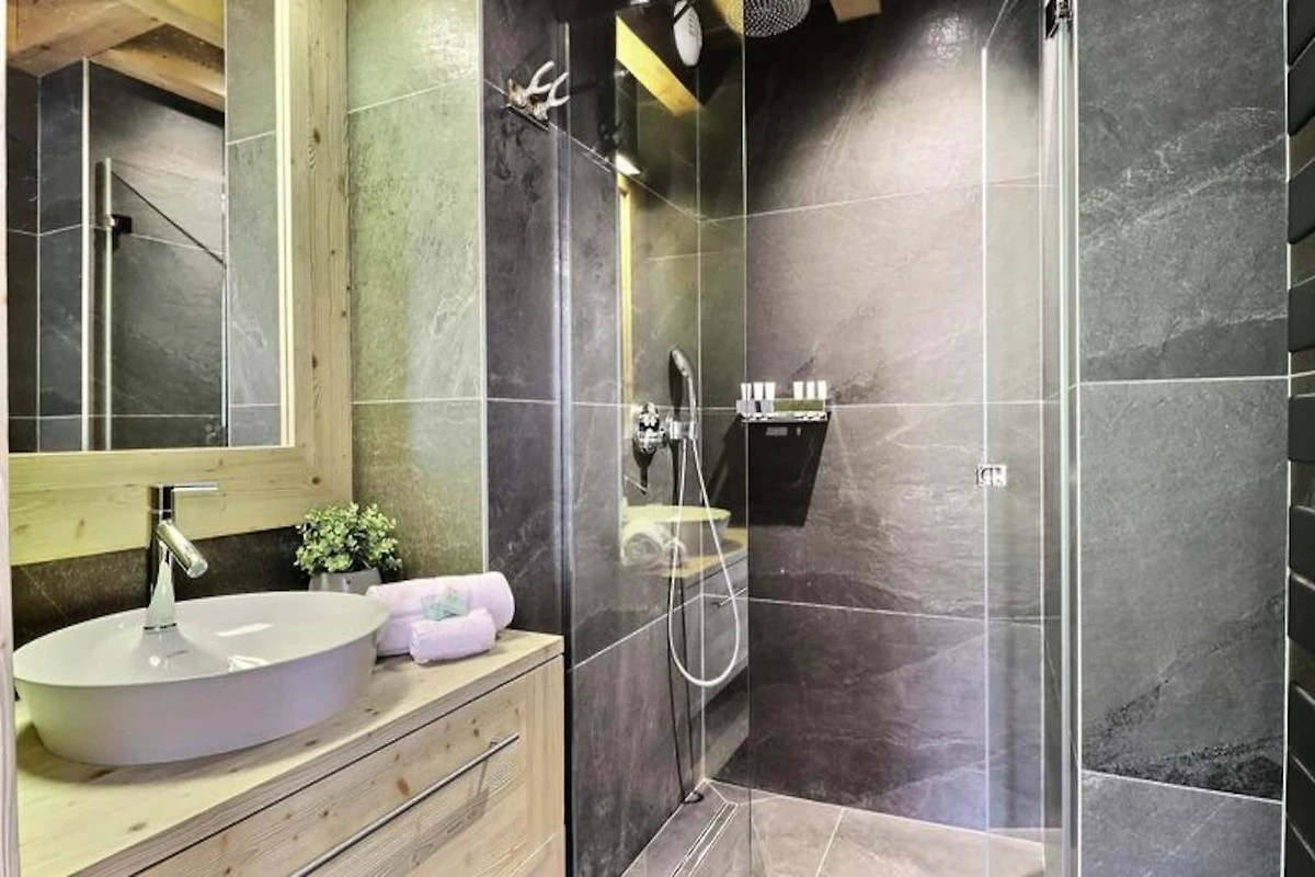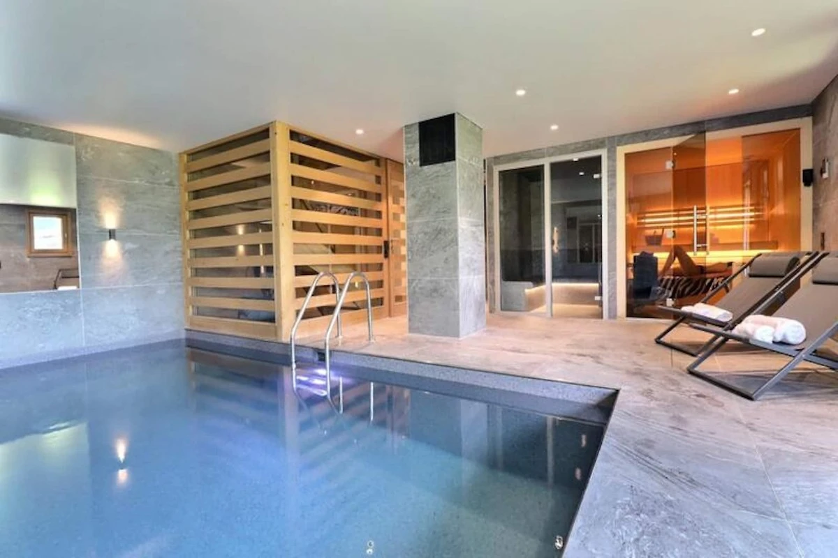 Treten Sie ein und entdecken Sie eine Oase der Ruhe und Eleganz. Das Chalet bietet Platz für bis zu 10 Gäste in fünf stilvoll eingerichteten Schlafzimmern, jedes mit eigenem Bad. Der warme und einladende Wohnbereich mit Kaminofen ist der perfekte Ort, um nach einem Tag auf der Piste oder den Wanderwegen zusammenzusitzen. Die voll ausgestattete Küche und der geräumige Essbereich laden zum gemeinsamen Essen und zum Schaffen unvergesslicher Erinnerungen ein. Für ultimative Entspannung bietet der Wellnessbereich im Untergeschoss einen beheizten Innenpool, eine Sauna und ein Hamam – ein privates Spa-Erlebnis mit direktem Zugang zum Garten.