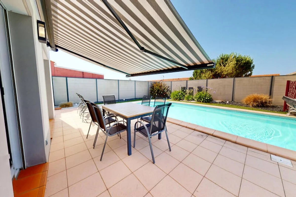 Draußen lockt die private Terrasse mit ihrem teilweise beschatteten Essbereich und dem einladenden Swimmingpool, der dank einer einziehbaren Kuppel ganzjährig genutzt werden kann. Entspannen Sie sich auf Sonnenliegen am Wasser oder genießen Sie Mahlzeiten im Freien unter der elektrischen Markise – alles in der Privatsphäre eines komplett umzäunten Gartens. Eine Garage bietet Platz für Fahrräder oder Strandutensilien und ermöglicht Ihnen so, die Umgebung bequem zu erkunden.
