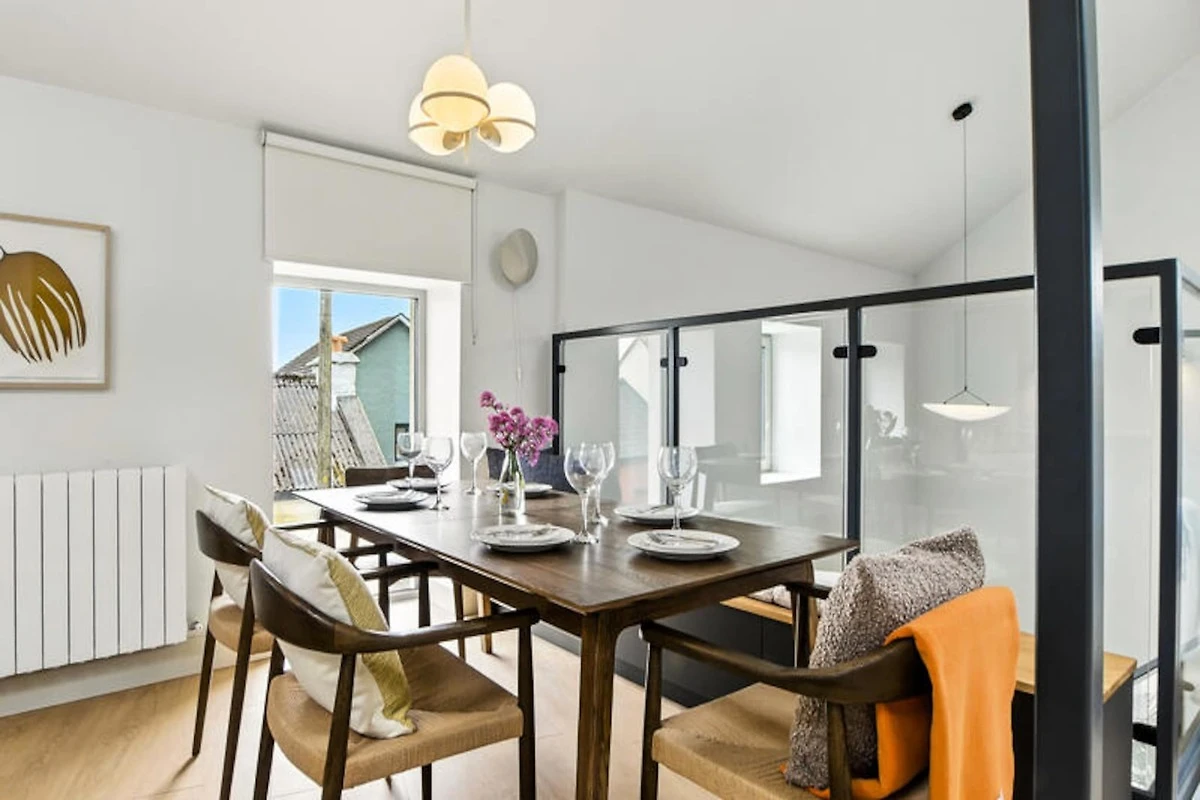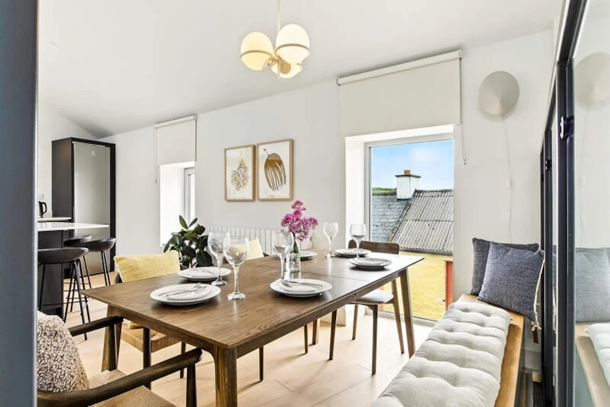 Auf großzügigen 334 m² bietet das Haus bequem Platz für bis zu vier Gäste in zwei gemütlichen Schlafzimmern. Die offene Küche ist mit modernen Geräten wie Kühlschrank, Backofen, Geschirrspüler und Kaffeemaschine ausgestattet, sodass Sie nach einem erlebnisreichen Tag im Handumdrehen leckere Mahlzeiten zubereiten können. Entspannen Sie sich im einladenden Wohnbereich mit WLAN, Fernseher und Wärmepumpenheizung, die Ihnen zu jeder Jahreszeit Komfort bieten. Praktische Annehmlichkeiten wie Waschmaschine, Trockner und Bügeleisen erhöhen Ihren Komfort, während liebevolle Details wie Föhn und Toaster für ein behagliches Zuhause-Gefühl sorgen.