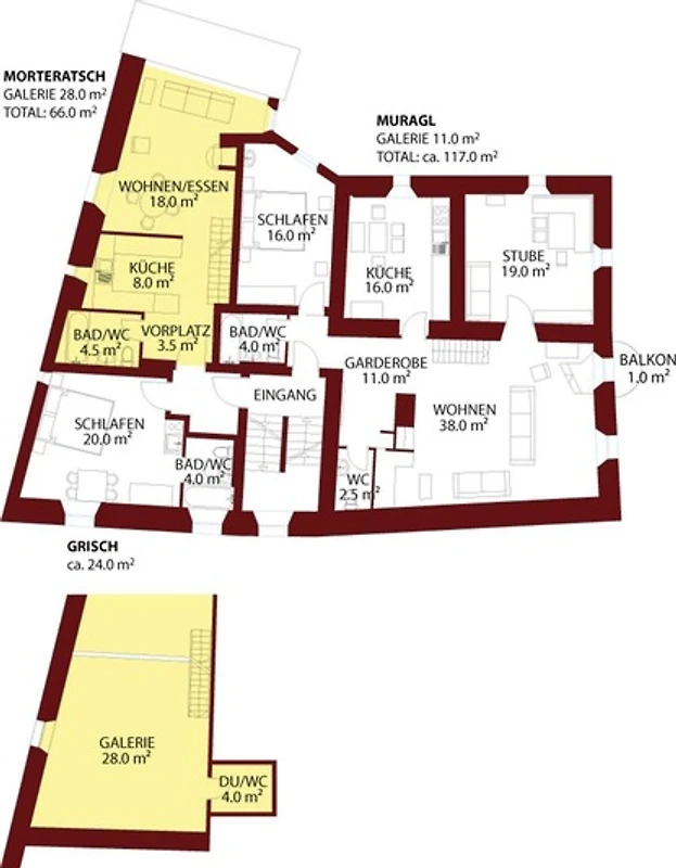 Die Wohnung Morteratsch bietet auf zwei Ebenen und 66 m² ein authentisches Engadiner Wohnerlebnis mit modernem Komfort. Der helle Wohn- und Essbereich mit Schwedenofen, Esstisch und Arvenmöbeln schafft eine gemütliche, alpine Atmosphäre. Die offene Arvenholzküche ist vollständig ausgestattet – mit Kochherd, Backofen, Geschirrspüler, Kühlschrank, Nespresso-Maschine, Wasserkocher und Fonduegeschirr. Auf der Galerie befinden sich vier Schlafplätze mit antiken Möbeln – ideal für Familien oder Freunde. Zwei Badezimmer, eines mit Badewanne und eines mit Dusche, bieten zusätzlichen Komfort. WLAN, ein Flachbild-TV mit Netflix und Bodenheizung runden das Angebot ab. Die Wohnung kann bei Bedarf direkt mit dem Studio Grisch kombiniert werden – perfekt für gemeinsame Ferien mit Privatsphäre.
