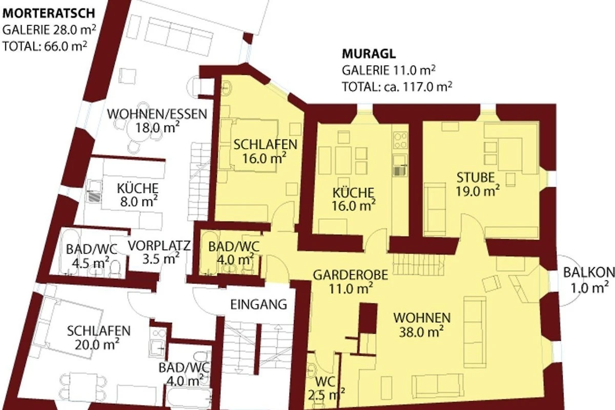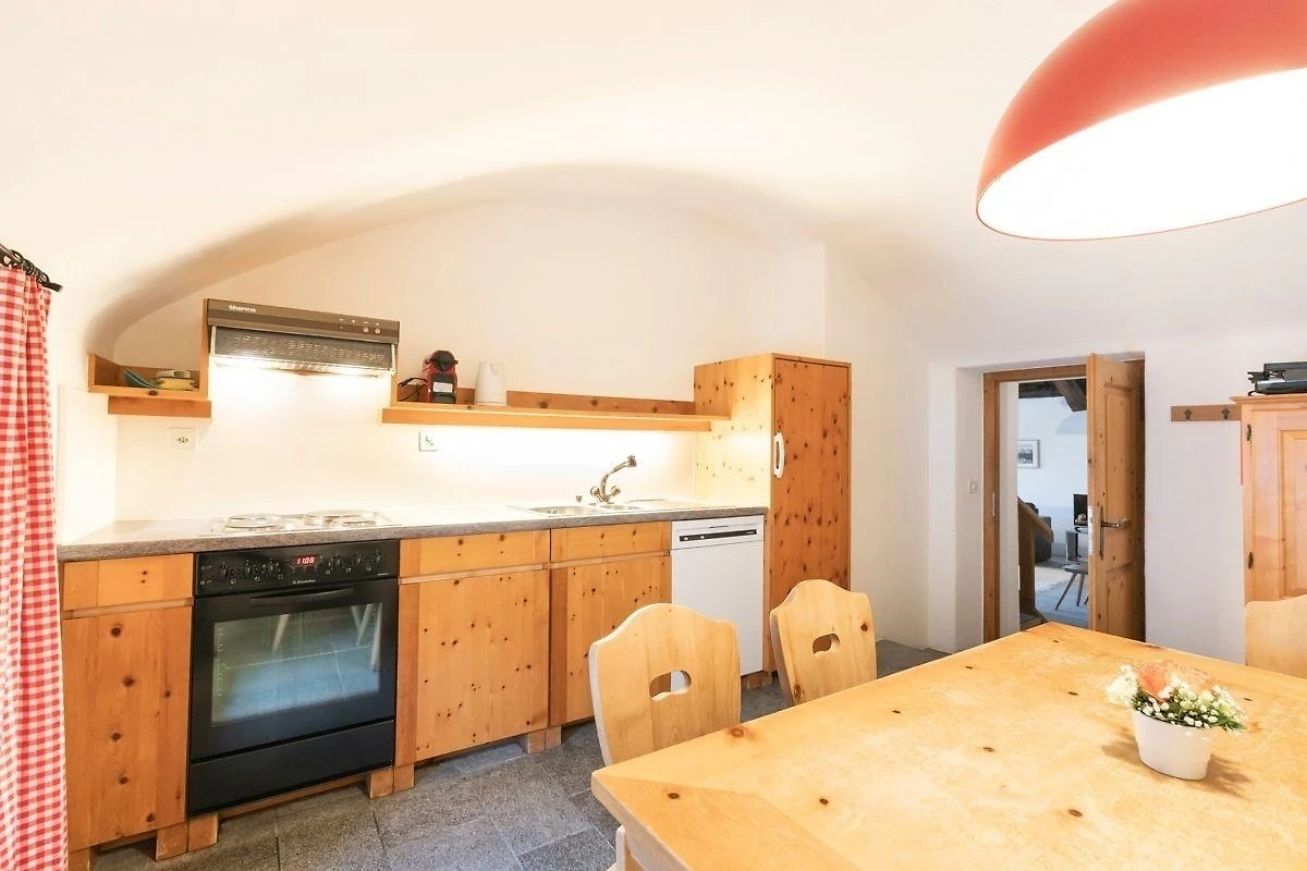 Die Wohnung Muragl bietet auf grosszügigen 117 m² und zwei Ebenen ein stilvolles Wohnerlebnis im traditionellen Engadiner Stil. Das Wohnzimmer mit Cheminée, Ledersofas und antiken Möbeln lädt zu gemütlichen Stunden ein, während die angrenzende Engadinerstube mit Esstisch, Eckbank und zusätzlichem Sofa eine warme, heimelige Atmosphäre schafft. Die historische Gewölbeküche ist vollständig ausgestattet – mit Kochherd, Backofen, Geschirrspüler, Kühlschrank, Nespresso-Maschine, Wasserkocher und Toaster. Auf der Galerie befinden sich zwei weitere Betten, ideal für Familien oder Freunde. Das Badezimmer mit Badewanne und das separate WC sorgen für zusätzlichen Komfort. WLAN, ein Flachbild-TV mit Netflix und Bodenheizung bieten moderne Annehmlichkeiten, während das Haus selbst Geschichte und Engadiner Charme atmet. Perfekt für bis zu sechs Personen, die Raum, Authentizität und alpine Gemütlichkeit schätzen.