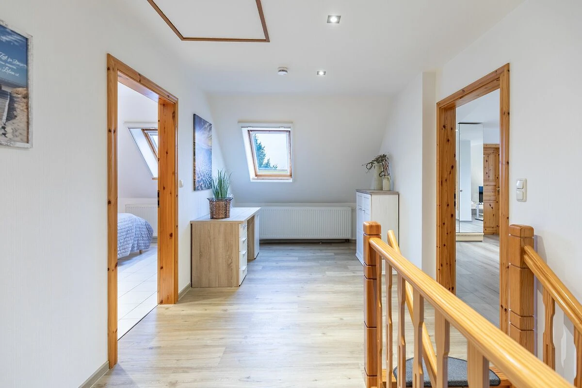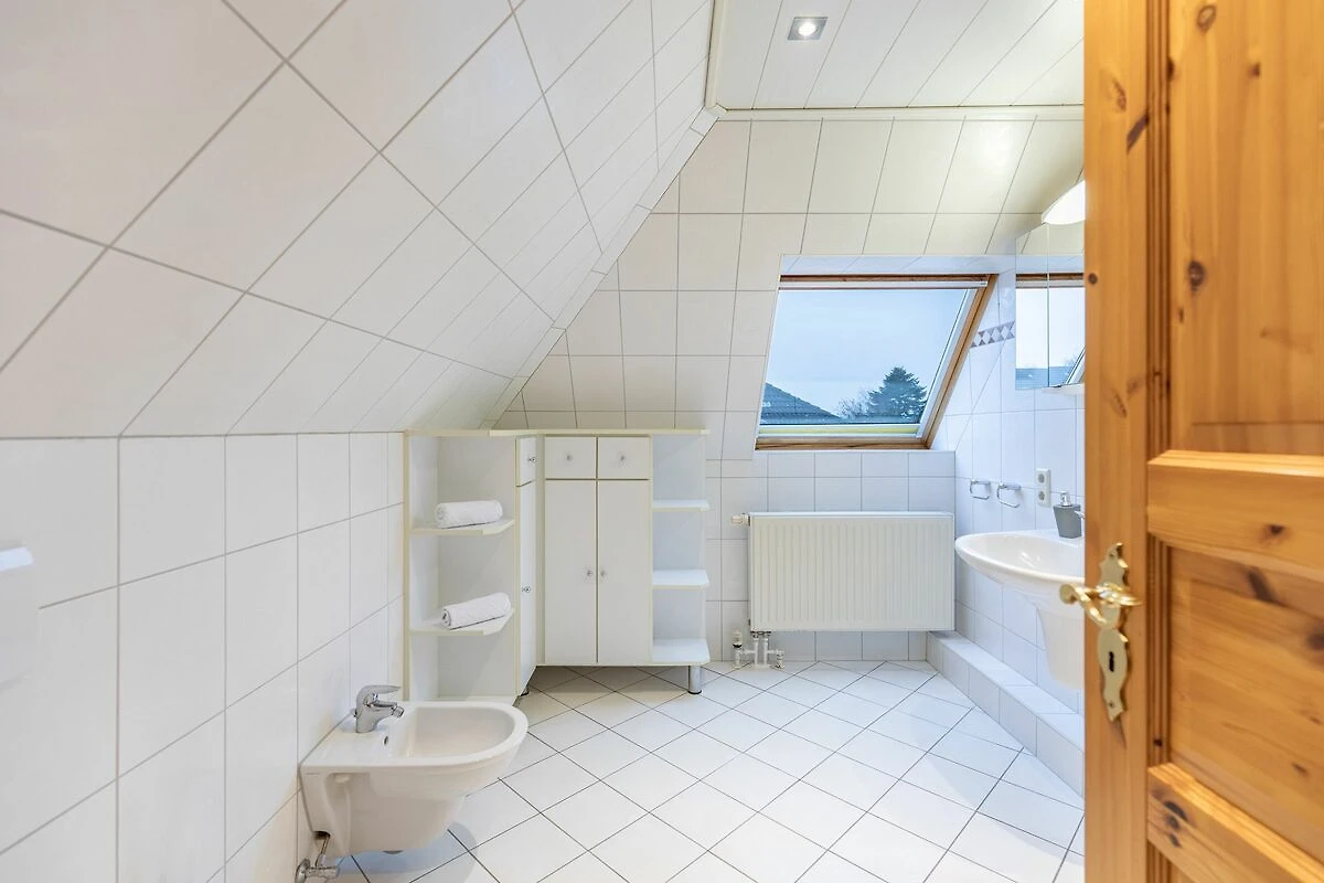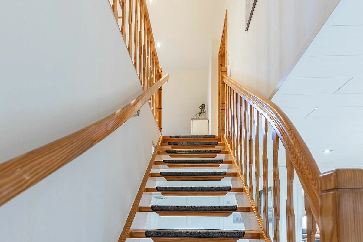 Über die offene Holztreppe gelangen Sie ins Dachgeschoss, wo Sie weitere Schlafräume, ein zweites Badezimmer sowie einen großen Wohn- und Schlafbereich mit zusätzlicher TV-Ecke erwarten.