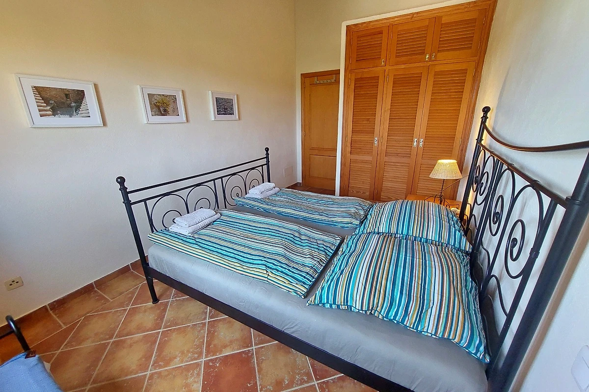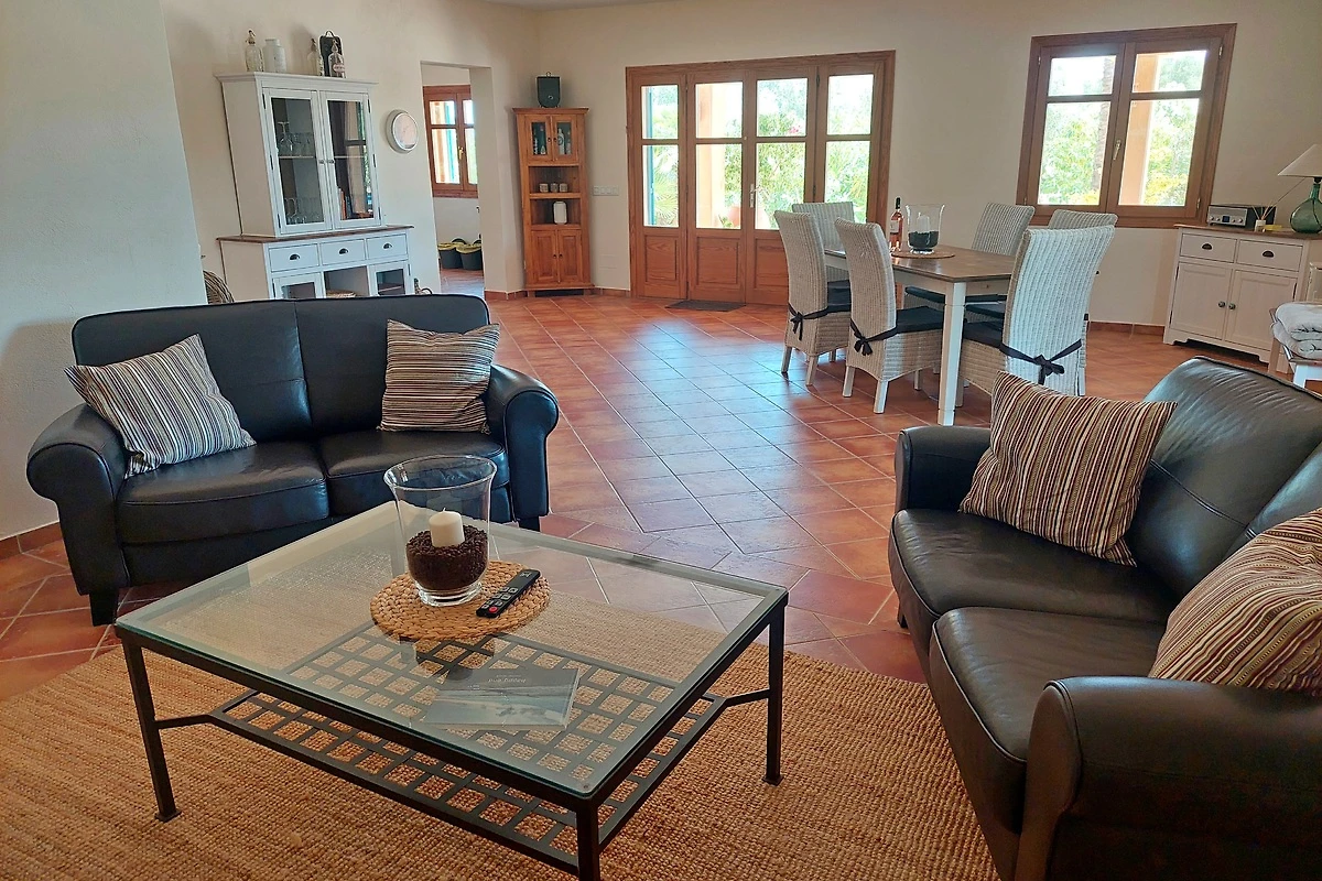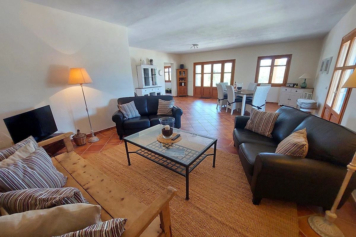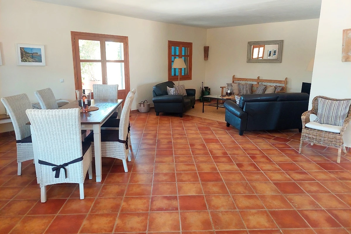 Im Erdgeschoss erwartet Sie ein großzügiger Wohn- und Essbereich mit Sat-TV, gemütlichen Sofas und Zugang zur überdachten Terrasse. Die voll ausgestattete Küche bietet Gas- und Cerankochfeld, Backofen und Geschirrspüler. Ein Schlafzimmer und ein Bad liegen ebenfalls im Erdgeschoss. Im Obergeschoss befinden sich zwei weitere Schlafzimmer – eines davon mit Zugang zum großen Balkon und herrlichem Blick über die Landschaft bis Santanyí.
