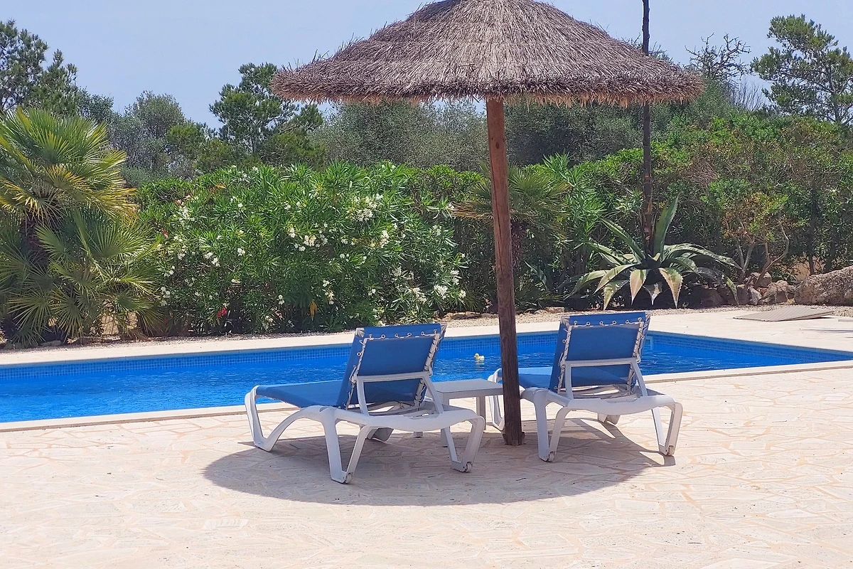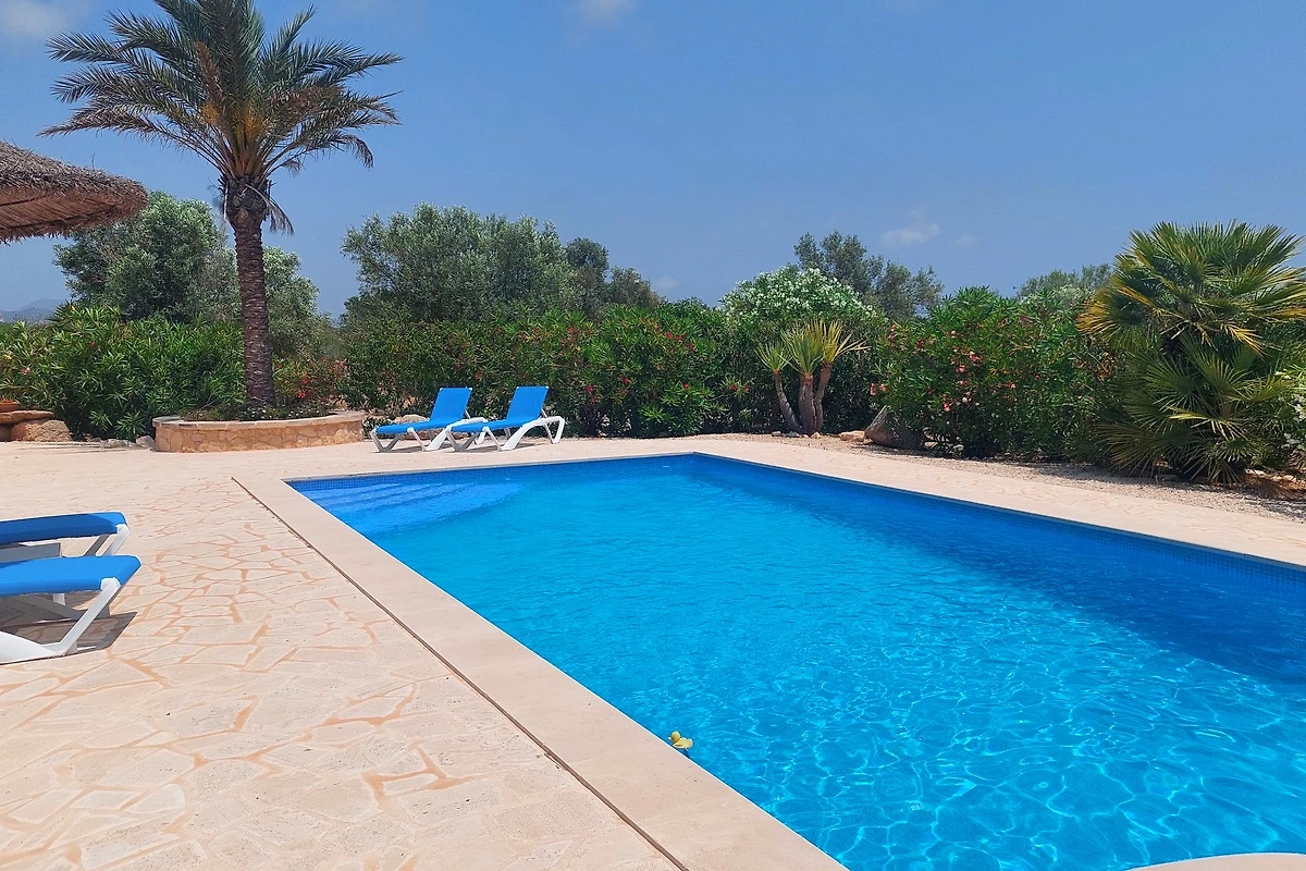 Der Außenbereich ist ein Highlight: Ein großer Pool (10 × 5 m) mit bequemen Treppeneinstieg, Sonnenliegen und eine überdachte Terrasse laden zum Entspannen ein. Der liebevoll angelegte Garten mit Palmen, Oleander und Kräutern schafft eine mediterrane Wohlfühloase. Ein überdachter Stellplatz sowie weitere Parkmöglichkeiten sind vorhanden.