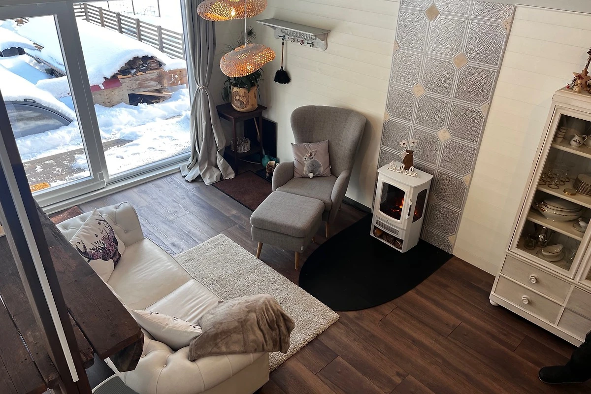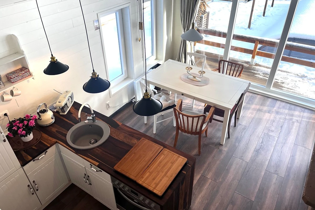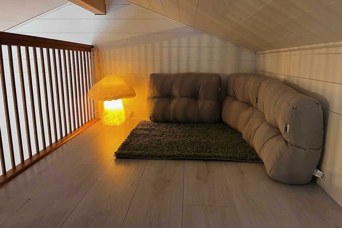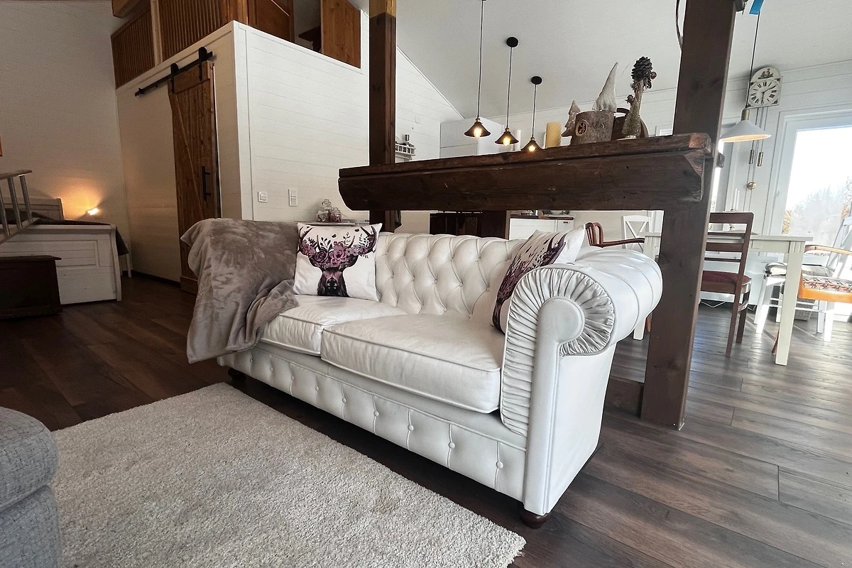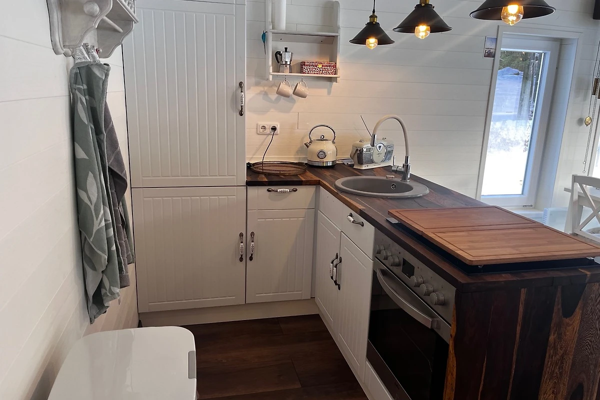 Der offene Wohnbereich bietet auf 56 Quadratmetern Platz für bis zu 4 Gäste. Ein großes Bett mit 200 x 200 Zentimetern sorgt für erholsamen Schlaf, zusätzlich steht im oberen Bereich eine Matratze für eine weitere Person zur Verfügung. Baby- oder Kinderreisebett können aufgestellt werden. Die Küche ist vollständig ausgestattet und ideal für gemeinsame Mahlzeiten. Das moderne Badezimmer verfügt über eine Regen-Dusche. Zwei Hunde sind willkommen und WLAN ist im Haus vorhanden.